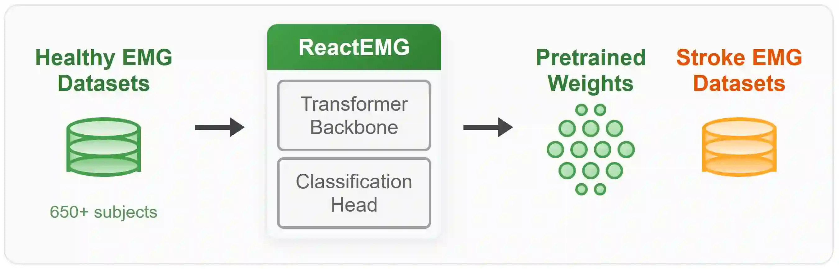翻译:表面肌电图(sEMG)是中风后按需辅助手部康复的一种有前景的控制信号,但从麻痹肌肉中检测意图通常需要冗长且针对特定受试者的校准,并且对变异性仍然敏感。我们提出了一种从健康到中风的适应流程:首先利用在大规模健康人群sEMG数据上预训练的模型初始化意图检测器,然后仅使用少量特定受试者数据为每位中风参与者进行微调。基于新收集的三名慢性中风患者的数据集,我们比较了不同的适应策略(仅微调头部层、参数高效的LoRA适配器以及完整的端到端微调),并在包含现实分布偏移(如会话内漂移、姿势变化和臂带重新定位)的保留测试集上进行了评估。在各种条件下,相对于相同数据预算下的零样本迁移和仅使用中风数据的训练,基于健康数据预训练的适应方法持续提升了中风意图检测的性能;最佳适应方法将平均转换准确率从0.42提升至0.61,原始准确率从0.69提升至0.78。这些结果表明,迁移可复用的健康领域肌电图表征能够减少校准负担,同时提升实时中风后意图检测的鲁棒性。