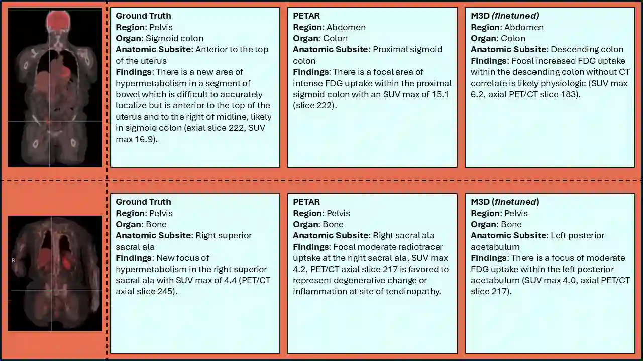 翻译:近期视觉语言模型(VLMs)的进展已实现卓越的多模态推理能力,但大多数医学应用仍局限于二维成像。本研究将VLMs扩展至三维正电子发射断层扫描与计算机断层扫描(PET/CT)领域,该领域具有大体积数据、小而分散的病灶以及冗长放射学报告的特点。我们引入了一个大规模数据集,包含超过11,000个病灶级描述与来自5,000余次PET/CT检查的三维分割结果,这些数据通过基于规则的混合流程与大型语言模型(LLM)流水线提取。基于此数据集,我们提出PETAR-4B——一个三维掩码感知视觉语言模型,它整合了PET、CT及病灶轮廓信息,实现空间锚定的报告生成。PETAR通过融合全局上下文推理与细粒度病灶感知,生成临床连贯且定位明确的发现。综合自动化与人工评估表明,PETAR显著提升了PET/CT报告生成质量,推动了三维医学视觉语言理解的发展。