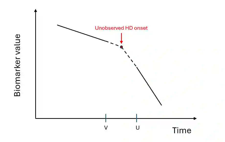 翻译:亨廷顿病(HD)是一种常染色体显性遗传的神经退行性疾病,其特征包括运动功能障碍、精神障碍和认知衰退。HD的发病以严重的运动损伤为标志,而发病前认知衰退可能预测其发生,发病后又会加剧认知缺陷。然而,临床数据通常在离散时间点收集,因此疾病发病时间存在区间删失。为应对此类数据带来的挑战,我们建立了一个针对多元纵向生物标志物的联合模型,该模型包含一个锚定于区间删失事件时间的变点。该模型同时评估了纵向生物标志物对事件时间的影响,以及事件发生后生物标志物轨迹的变化。我们进行了全面的模拟研究,以验证所提方法在因果推断中的有限样本性能。最后,我们将该方法应用于PREDICT-HD——一项针对前驱期HD个体的多中心观察性队列研究,以确定认知障碍与运动功能障碍在疾病进展过程中如何相互作用。