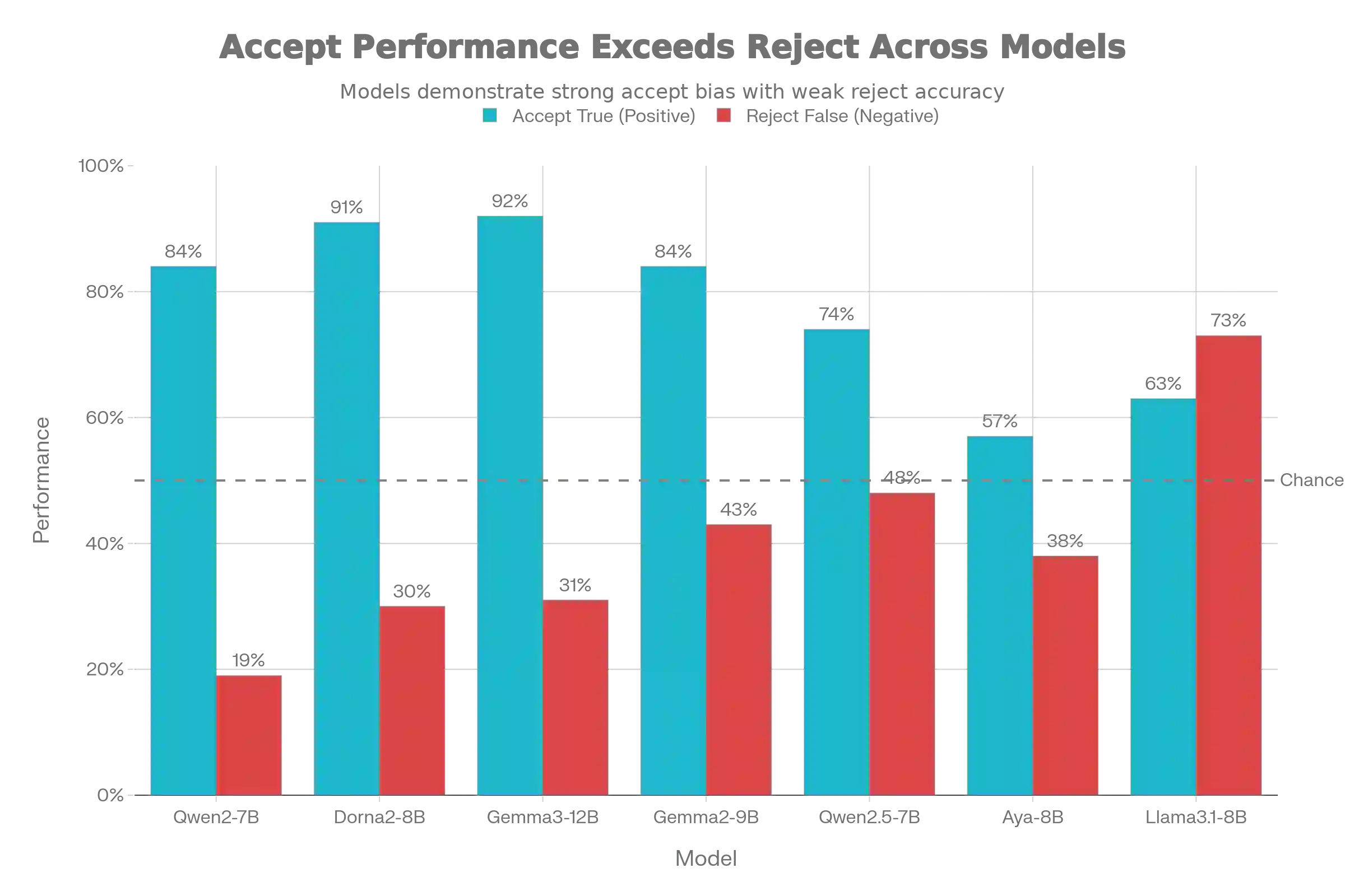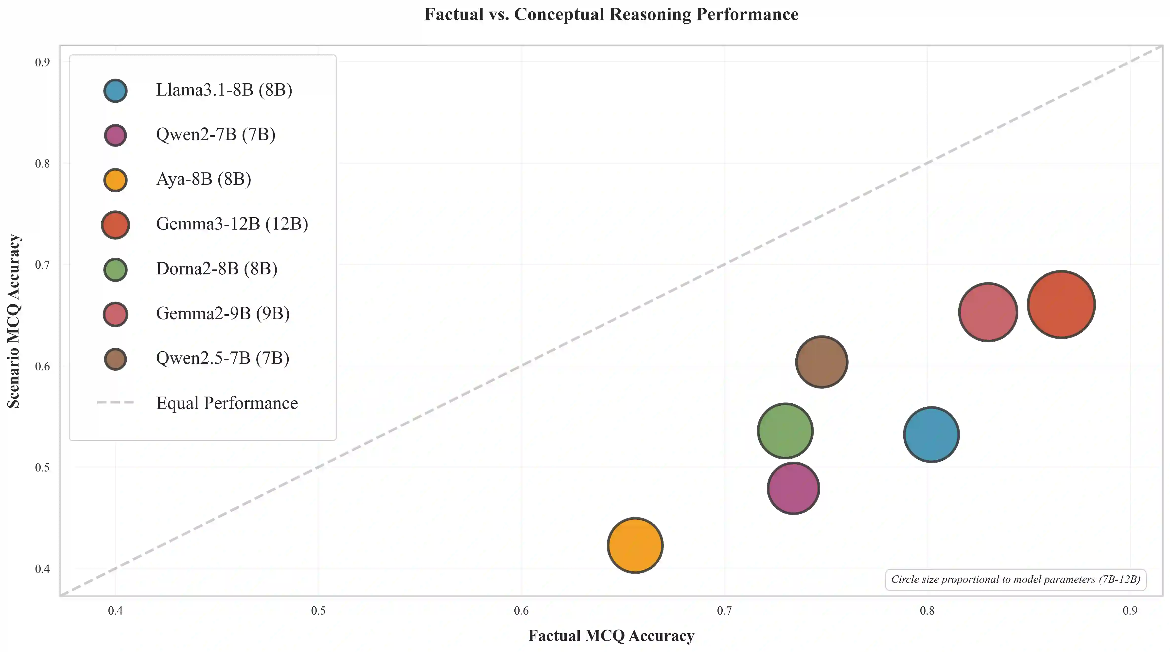 翻译:尽管新兴的波斯语自然语言处理基准已扩展至语用学和礼貌性研究领域,但它们很少能区分记忆性文化事实与推理隐含社会规范的能力。本文提出DivanBench——一个专注于迷信与习俗的诊断性基准,这些任意且依赖情境的规则难以通过简单逻辑推演解决。通过涵盖三种任务类型(事实检索、配对情境验证及情境推理)的315道问题,我们对七款波斯语大语言模型进行评估,并揭示出三个关键缺陷:多数模型表现出严重的默许偏差,能够正确识别恰当行为却无法拒绝明显的违规情形;持续的波斯语预训练非但未能提升推理能力,反而放大了这种偏差,常常削弱模型识别矛盾的能力;所有模型在检索事实性知识与在情境中应用该知识之间均存在21%的性能差距。这些发现表明,文化能力所需的不只是单语数据的规模扩展,因为当前模型仅学会模仿文化模式,而未能内化其底层认知图式。
