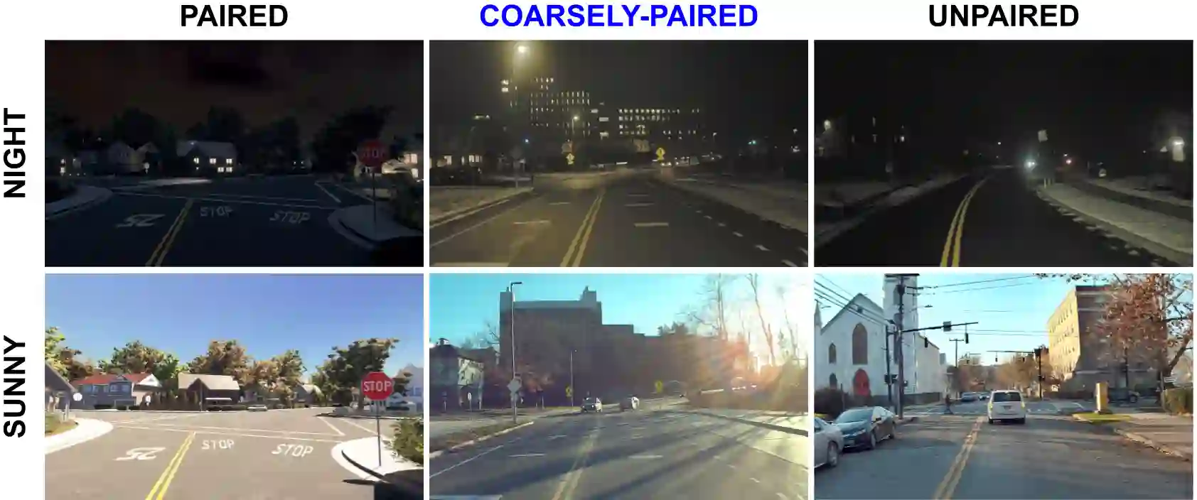 A self-driving car must be able to reliably handle adverse weather conditions (e.g., snowy) to operate safely. In this paper, we investigate the idea of turning sensor inputs (i.e., images) captured in an adverse condition into a benign one (i.e., sunny), upon which the downstream tasks (e.g., semantic segmentation) can attain high accuracy. Prior work primarily formulates this as an unpaired image-to-image translation problem due to the lack of paired images captured under the exact same camera poses and semantic layouts. While perfectly-aligned images are not available, one can easily obtain coarsely-paired images. For instance, many people drive the same routes daily in both good and adverse weather; thus, images captured at close-by GPS locations can form a pair. Though data from repeated traversals are unlikely to capture the same foreground objects, we posit that they provide rich contextual information to supervise the image translation model. To this end, we propose a novel training objective leveraging coarsely-aligned image pairs. We show that our coarsely-aligned training scheme leads to a better image translation quality and improved downstream tasks, such as semantic segmentation, monocular depth estimation, and visual localization.