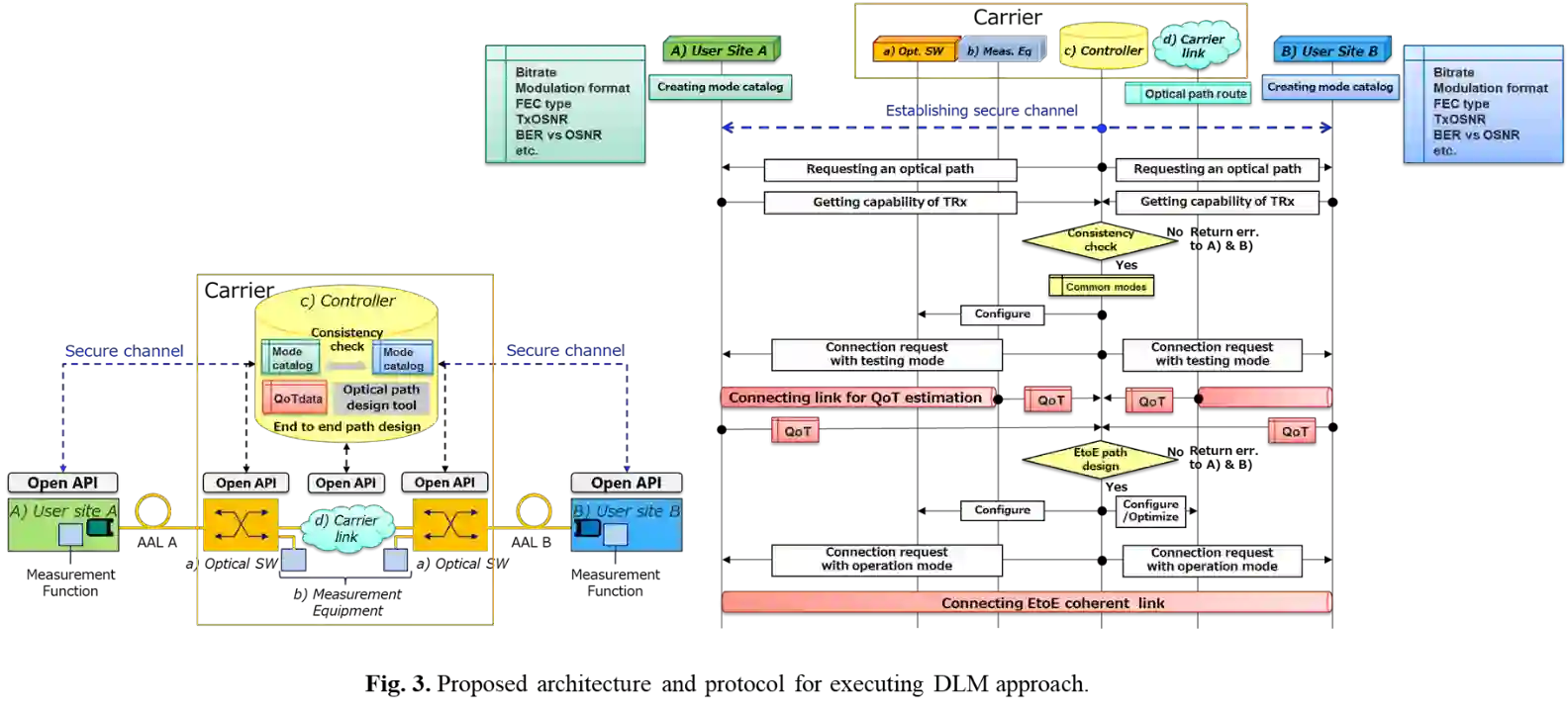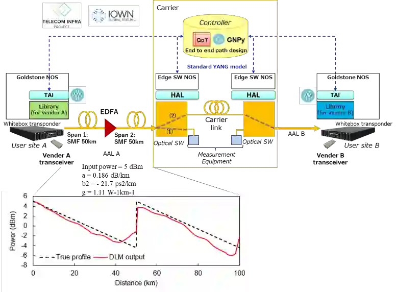 翻译:随着数据中心互联互通(DCI)和当地5G的扩展,越来越需要通过高容量光学连接,在客户地点之间建立动态的连接,然而,信号功率剖面和放大器增益等链接参数往往不为人所知,必须由专家加以测量,以防止因耗费时间的人工测量而提供动态路径。虽然提出了几种估算这种外来接入链接的未知参数的技术,但没有提出任何推动估算技术在客户地点之间建立光学路径的架构和协议。我们的研究的目的是通过外部接入连接自动连接客户拥有的收发器和最佳传输质量(QoT),我们首先提出客户和承运人之间合作光学路径设计的结构和协议,利用最新技术估算链接参数。我们随后在软件定义的网络(SDN)控制器和白箱转发器中采用开放的API执行拟议的协议。实验表明,光学路径是动态地通过从收发器冷机起起的137秒的外来访问链接建立的。我们首先讨论QOT准确性和剩余问题。