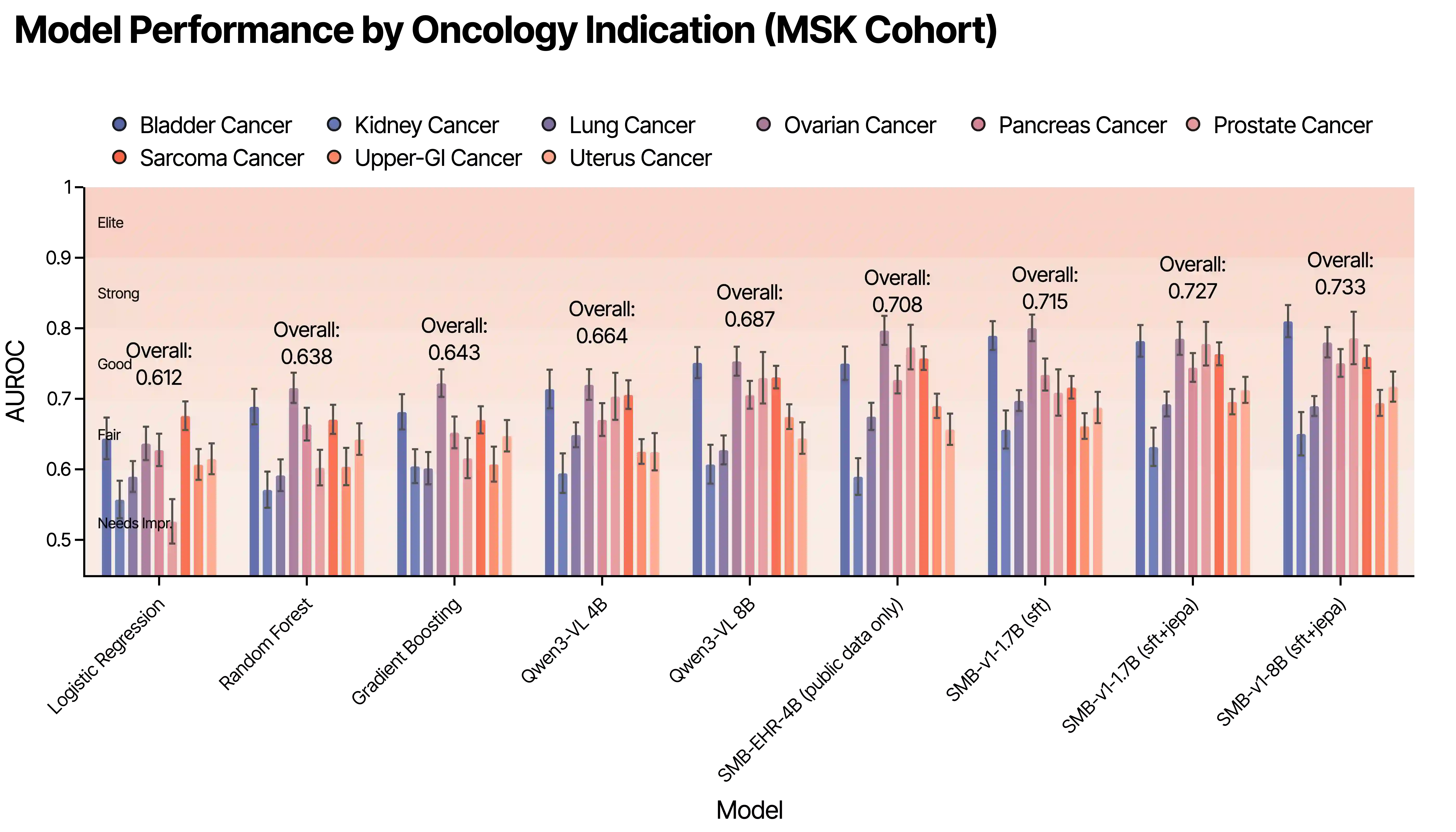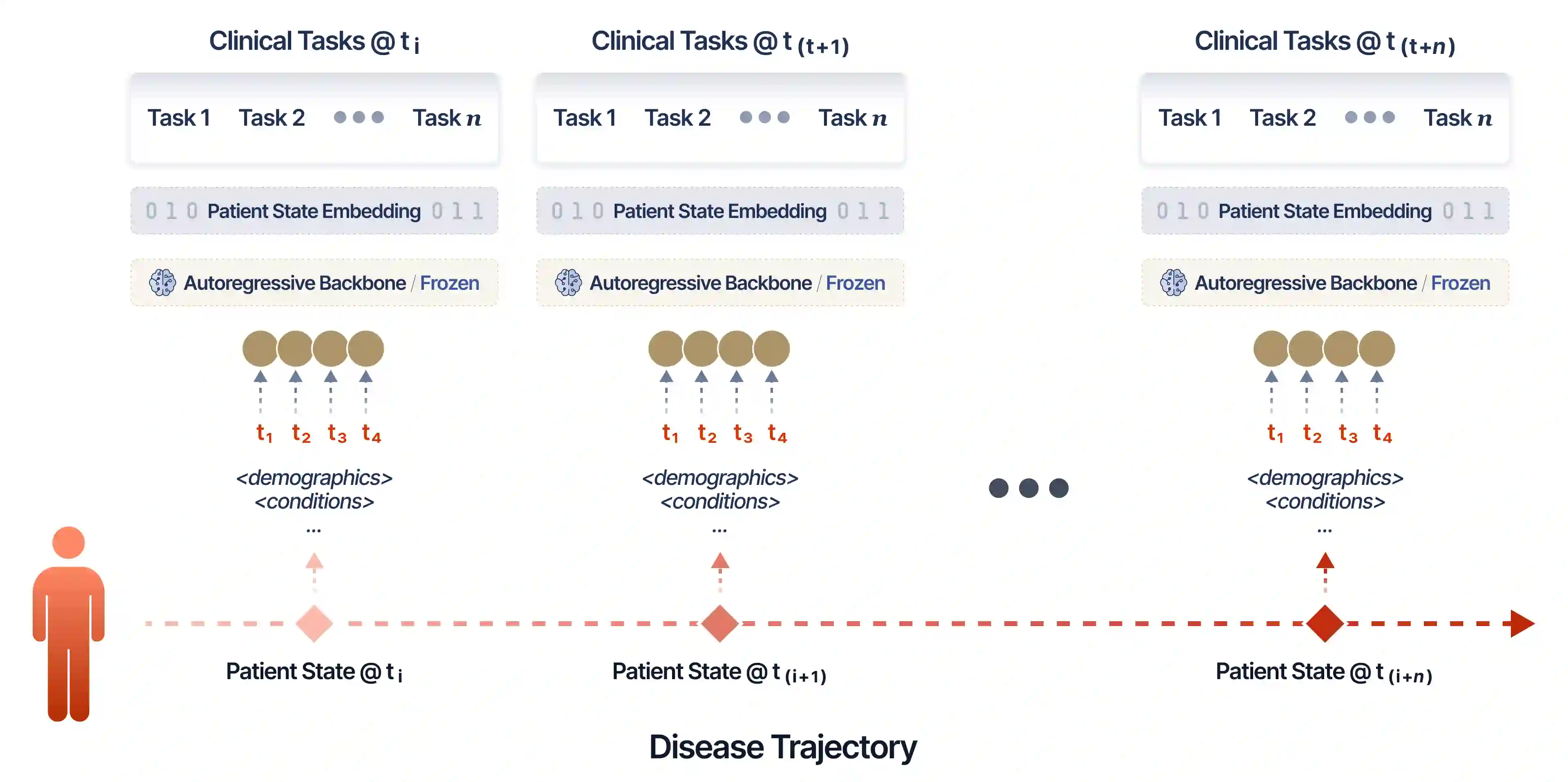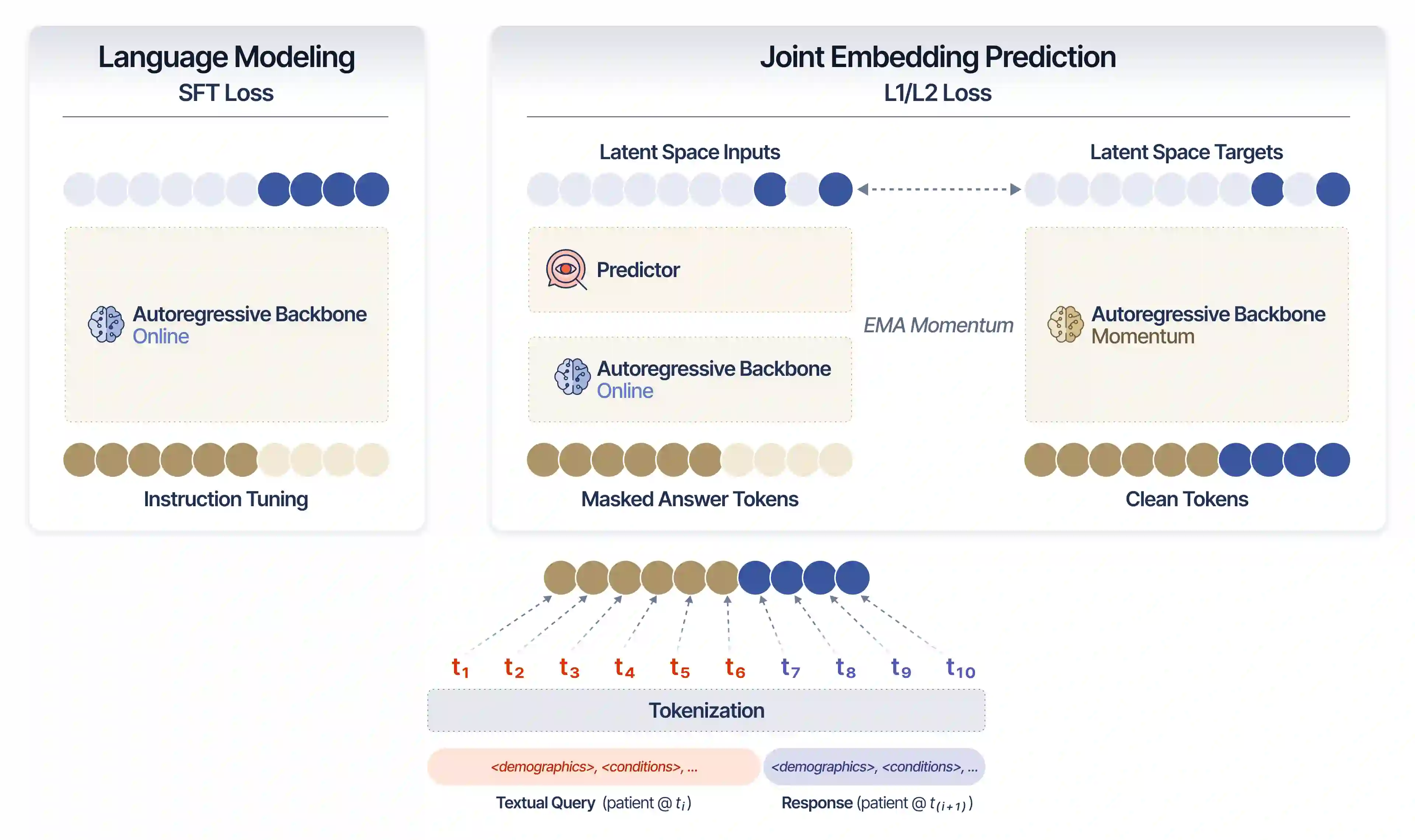 翻译:通过下一词预测训练的大型语言模型(LLM)已成为成功的临床基础模型。这些语言骨干网络生成的表征在生物医学任务中展现出强大的线性探针性能,表明患者语义能够通过大规模的下一个词预测任务自然涌现。然而,该范式将患者视为待总结的文档,而非待模拟的动态系统;患者的病程轨迹源于其状态在干预措施和时间作用下的演化,这要求模型能够模拟动态过程而非仅预测词元。为此,我们提出SMB-Structure——一种面向结构化电子健康记录的世界模型,该模型将联合嵌入预测架构(JEPA)与下一词元预测(SFT)相结合。SFT使模型能够在词元空间中重建未来患者状态,而JEPA仅基于初始患者表征在潜在空间中预测未来状态,从而强制模型在观测到下一状态前编码轨迹动态信息。我们在两个大规模队列中进行了验证:纪念斯隆凯特琳癌症中心(23,319名肿瘤患者;超323,000患者-年)和INSPECT队列(19,402名肺栓塞患者)。通过沿疾病轨迹多个时间点评估的线性探针,我们证明该训练范式学习到的嵌入能够捕捉自回归基线模型无法恢复的疾病动态特征,使SMB-Structure在具有高度患者异质性的复杂任务中取得具有竞争力的性能。模型权重发布于https://huggingface.co/standardmodelbio/SMB-v1-1.7B-Structure。