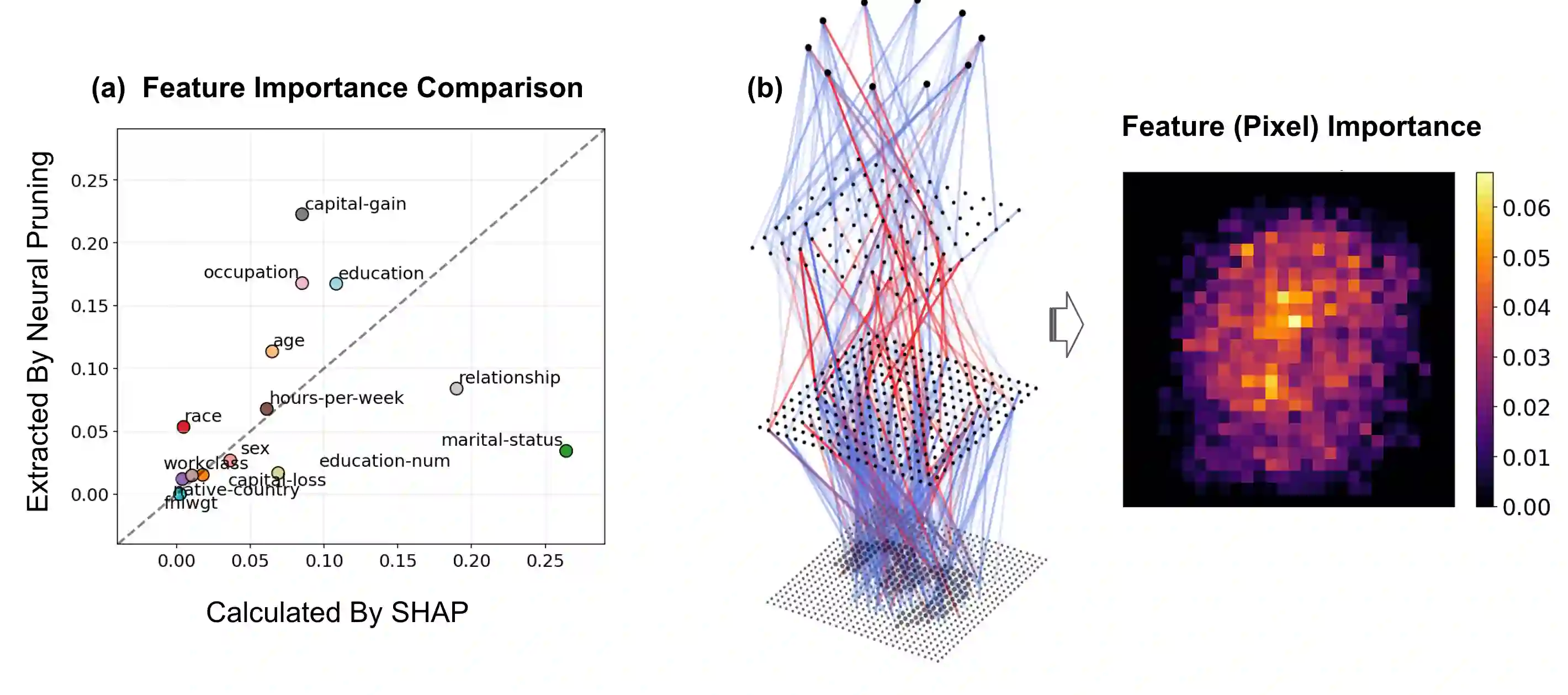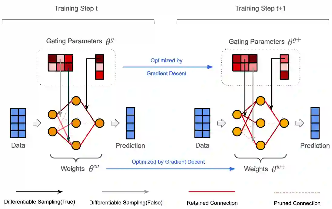 The rapid increase in the parameters of deep learning models has led to significant costs, challenging computational efficiency and model interpretability. In this paper, we introduce a novel and straightforward neural network pruning framework that incorporates the Gumbel-Softmax technique. This framework enables the simultaneous optimization of a network's weights and topology in an end-to-end process using stochastic gradient descent. Empirical results demonstrate its exceptional compression capability, maintaining high accuracy on the MNIST dataset with only 0.15\% of the original network parameters. Moreover, our framework enhances neural network interpretability, not only by allowing easy extraction of feature importance directly from the pruned network but also by enabling visualization of feature symmetry and the pathways of information propagation from features to outcomes. Although the pruning strategy is learned through deep learning, it is surprisingly intuitive and understandable, focusing on selecting key representative features and exploiting data patterns to achieve extreme sparse pruning. We believe our method opens a promising new avenue for deep learning pruning and the creation of interpretable machine learning systems.