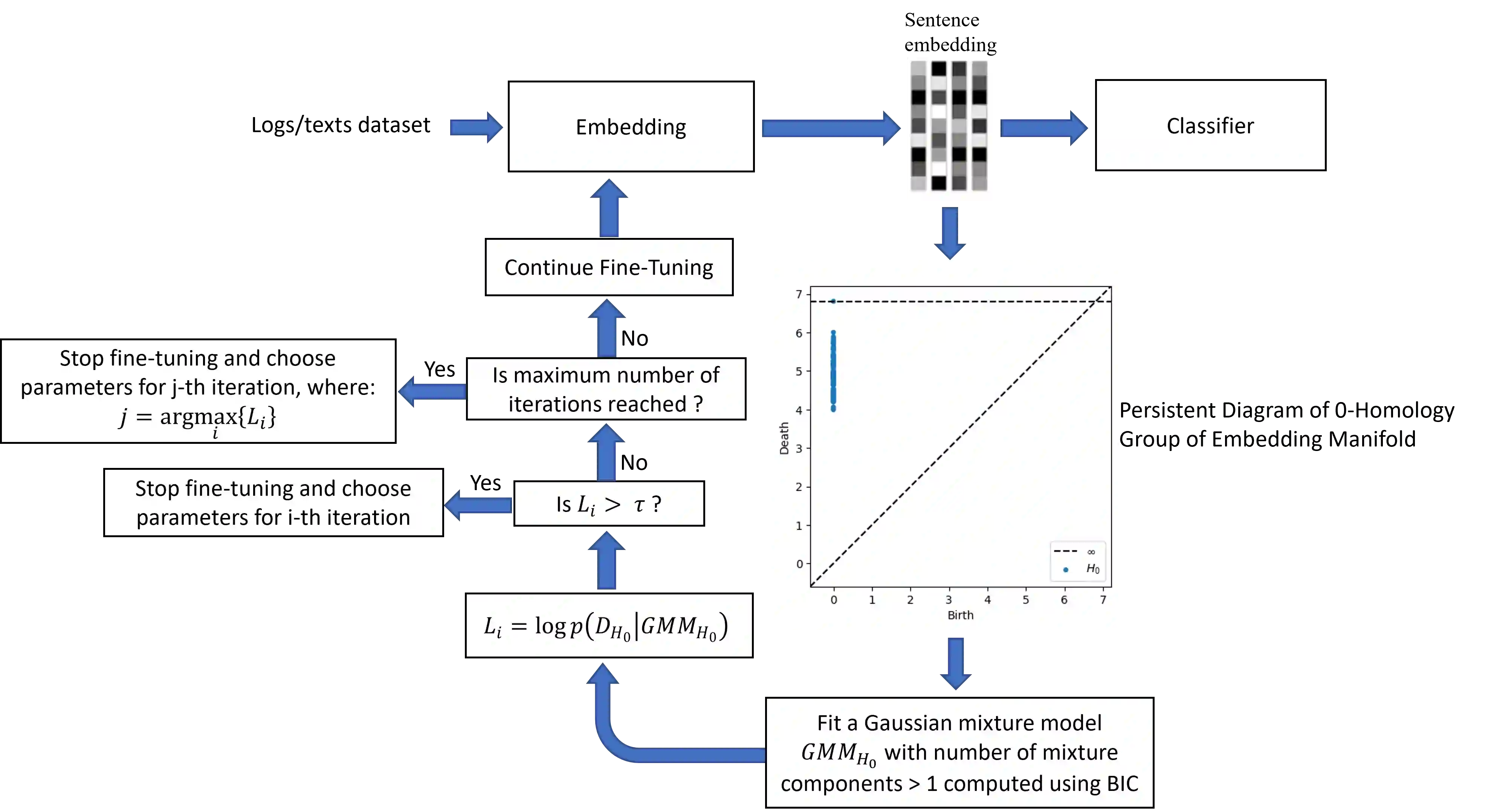 This paper proposes an unsupervised method that leverages topological characteristics of data manifolds to estimate class separability of the data without requiring labels. Experiments conducted in this paper on several datasets demonstrate a clear correlation and consistency between the class separability estimated by the proposed method with supervised metrics like Fisher Discriminant Ratio~(FDR) and cross-validation of a classifier, which both require labels. This can enable implementing learning paradigms aimed at learning from both labeled and unlabeled data, like semi-supervised and transductive learning. This would be particularly useful when we have limited labeled data and a relatively large unlabeled dataset that can be used to enhance the learning process. The proposed method is implemented for language model fine-tuning with automated stopping criterion by monitoring class separability of the embedding-space manifold in an unsupervised setting. The proposed methodology has been first validated on synthetic data, where the results show a clear consistency between class separability estimated by the proposed method and class separability computed by FDR. The method has been also implemented on both public and internal data. The results show that the proposed method can effectively aid -- without the need for labels -- a decision on when to stop or continue the fine-tuning of a language model and which fine-tuning iteration is expected to achieve a maximum classification performance through quantification of the class separability of the embedding manifold.