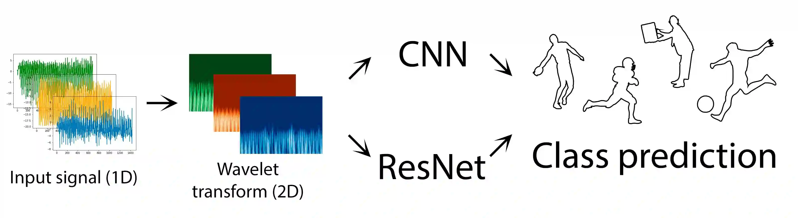 Quite a few people in the world have to stay under permanent surveillance for health reasons; they include diabetic people or people with some other chronic conditions, the elderly and the disabled.These groups may face heightened risk of having life-threatening falls or of being struck by a syncope. Due to limited availability of resources a substantial part of people at risk can not receive necessary monitoring and thus are exposed to excessive danger. Nowadays, this problem is usually solved via applying Human Activity Recognition (HAR) methods. HAR is a perspective and fast-paced Data Science field, which has a wide range of application areas such as healthcare, sport, security etc. However, the currently techniques of recognition are markedly lacking in accuracy, hence, the present paper suggests a highly accurate method for human activity classification. Wepropose a new workflow to address the HAR problem and evaluate it on the UniMiB SHAR dataset, which consists of the accelerometer signals. The model we suggest is based on continuous wavelet transform (CWT) and convolutional neural networks (CNNs). Wavelet transform localizes signal features both in time and frequency domains and after that a CNN extracts these features and recognizes activity. It is also worth noting that CWT converts 1D accelerometer signal into 2D images and thus enables to obtain better results as 2D networks have a significantly higher predictive capacity. In the course of the work we build a convolutional neural network and vary such model parameters as number of spatial axes, number of layers, number of neurons in each layer, image size, type of mother wavelet, the order of zero moment of mother wavelet etc. Besides, we also apply models with residual blocks which resulted in significantly higher metric values. Finally, we succeed to reach 99.26 % accuracy and it is a worthy performance for this problem.