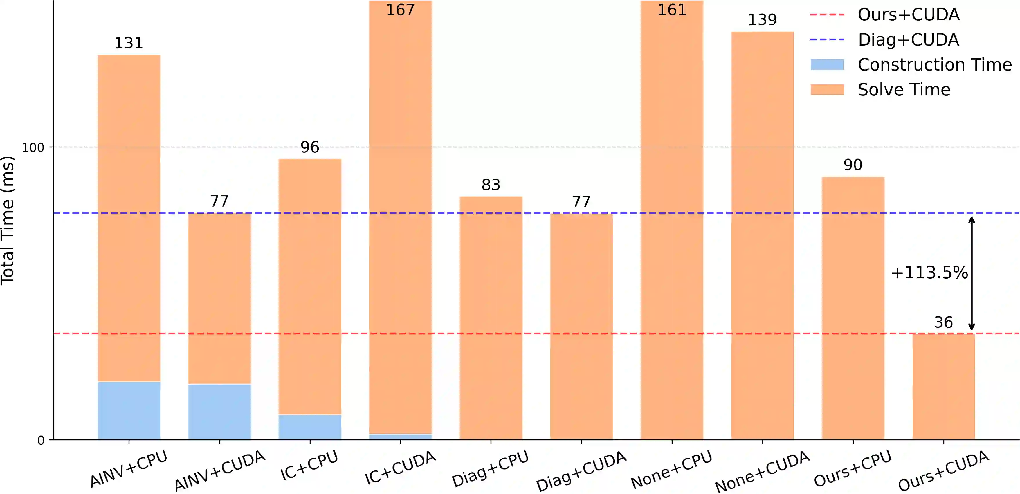 翻译:共轭梯度求解器(CG)是求解对称正定线性系统Ax=b的常用方法,其中有效的预条件子对于快速收敛至关重要。传统预条件子依赖于预设算法以提供严格的理论保证,但限制了其从数据中利用优化的能力。现有的基于学习的方法常利用图神经网络(GNNs)来提升性能并加速构造过程。然而,这些方法对不完全分解的依赖带来了显著挑战:相关的三角求解在实际中阻碍了GPU并行化,并引入了GNNs难以建模的长程依赖关系。为解决这些问题,我们提出一种基于学习的方法来生成GPU友好的预条件子,特别是利用GNNs构造稀疏近似逆(SPAI)预条件子,该方法避免了三角求解,且在每个CG步仅需两次矩阵-向量乘积。矩阵-向量乘积的局部性与GNNs的局部传播机制相兼容。GNNs的灵活性也使我们的方法适用于广泛场景。此外,我们引入了一种基于统计的尺度不变损失函数。其设计匹配了CG的收敛速率依赖于条件数而非A的绝对尺度的特性,从而提升了所学预条件子的性能。在三个偏微分方程衍生数据集和一个合成数据集上的评估表明,我们的方法在GPU上优于标准预条件子(对角、不完全Cholesky和传统SPAI)及先前基于学习的预条件子。我们将GPU上的求解时间减少了40%-53%(加速68%-113%),同时获得了更好的条件数和优异的泛化性能。源代码发布于 https://github.com/Adversarr/LearningSparsePreconditioner4GPU。