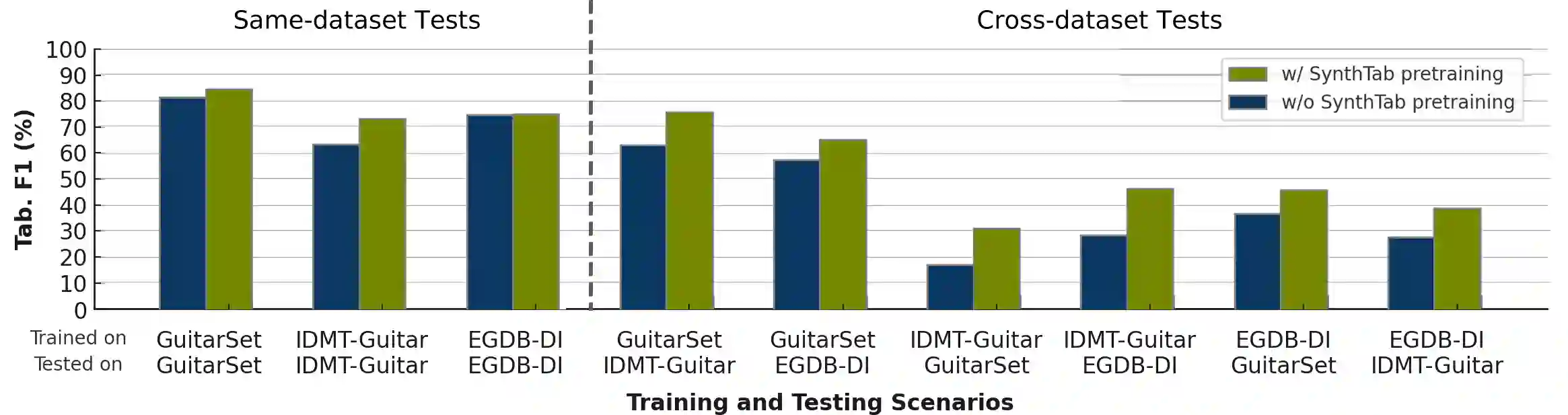 Guitar tablature is a form of music notation widely used among guitarists. It captures not only the musical content of a piece, but also its implementation and ornamentation on the instrument. Guitar Tablature Transcription (GTT) is an important task with broad applications in music education and entertainment. Existing datasets are limited in size and scope, causing state-of-the-art GTT models trained on such datasets to suffer from overfitting and to fail in generalization across datasets. To address this issue, we developed a methodology for synthesizing SynthTab, a large-scale guitar tablature transcription dataset using multiple commercial acoustic and electric guitar plugins. This dataset is built on tablatures from DadaGP, which offers a vast collection and the degree of specificity we wish to transcribe. The proposed synthesis pipeline produces audio which faithfully adheres to the original fingerings, styles, and techniques specified in the tablature with diverse timbre. Experiments show that pre-training state-of-the-art GTT model on SynthTab improves transcription accuracy in same-dataset tests. More importantly, it significantly mitigates overfitting problems of GTT models in cross-dataset evaluation.