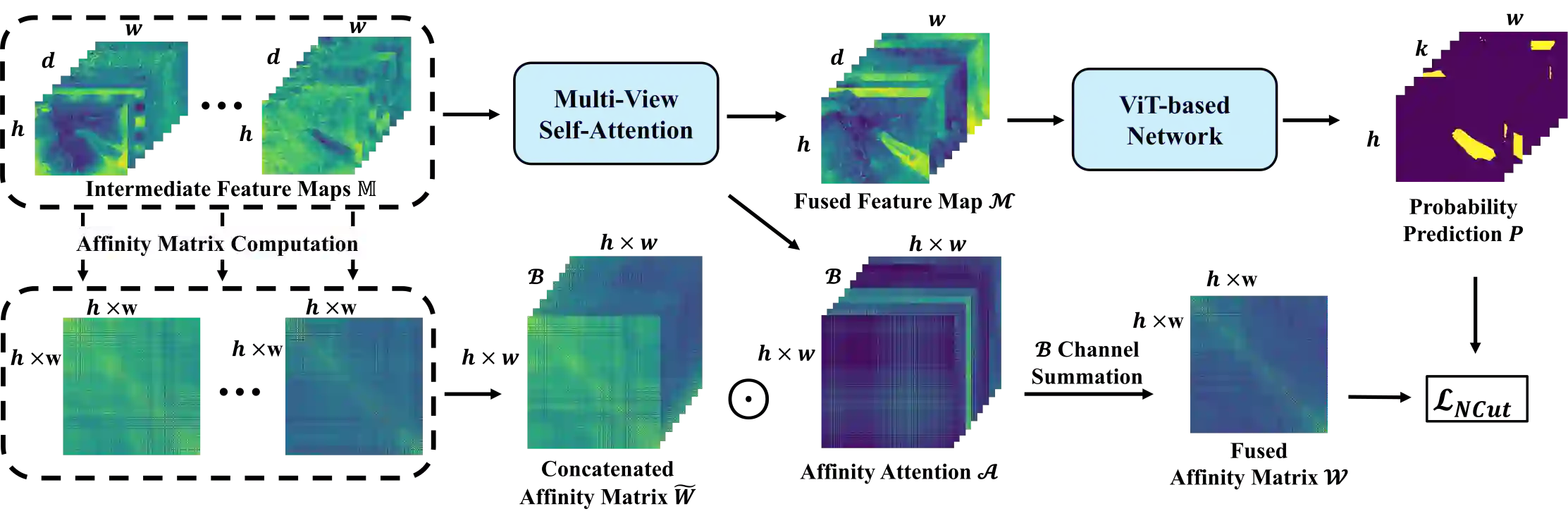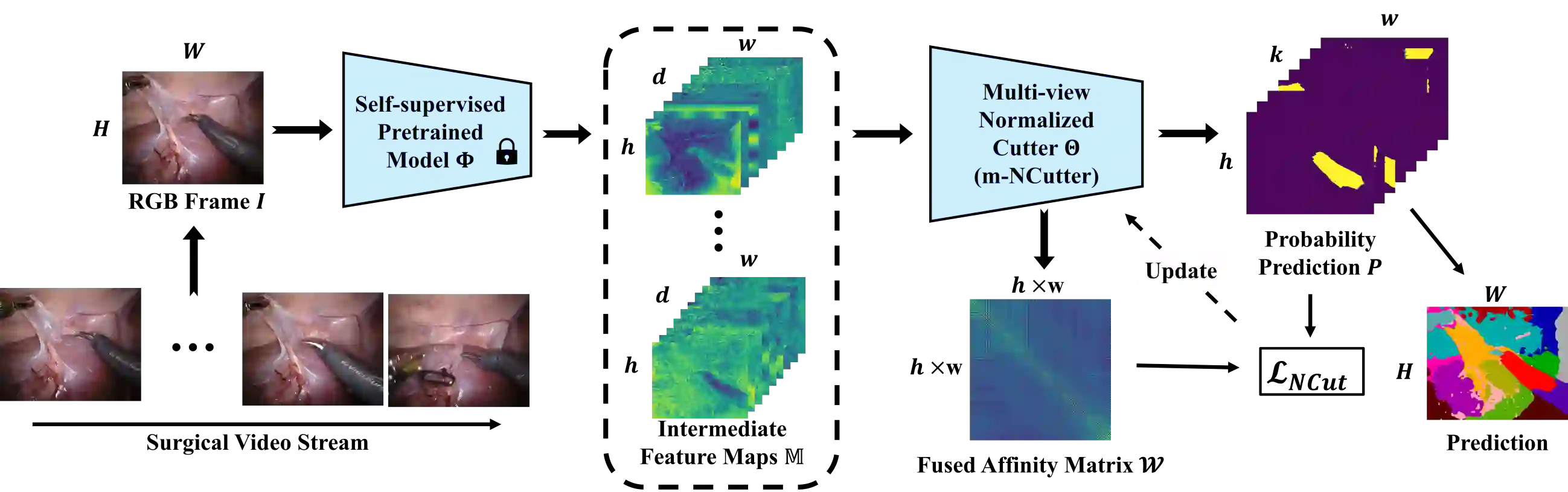 Surgical instrument segmentation (SIS) is pivotal for robotic-assisted minimally invasive surgery, assisting surgeons by identifying surgical instruments in endoscopic video frames. Recent unsupervised surgical instrument segmentation (USIS) methods primarily rely on pseudo-labels derived from low-level features such as color and optical flow, but these methods show limited effectiveness and generalizability in complex and unseen endoscopic scenarios. In this work, we propose a label-free unsupervised model featuring a novel module named Multi-View Normalized Cutter (m-NCutter). Different from previous USIS works, our model is trained using a graph-cutting loss function that leverages patch affinities for supervision, eliminating the need for pseudo-labels. The framework adaptively determines which affinities from which levels should be prioritized. Therefore, the low- and high-level features and their affinities are effectively integrated to train a label-free unsupervised model, showing superior effectiveness and generalization ability. We conduct comprehensive experiments across multiple SIS datasets to validate our approach's state-of-the-art (SOTA) performance, robustness, and exceptional potential as a pre-trained model. Our code is released at https://github.com/MingyuShengSMY/AMNCutter.
