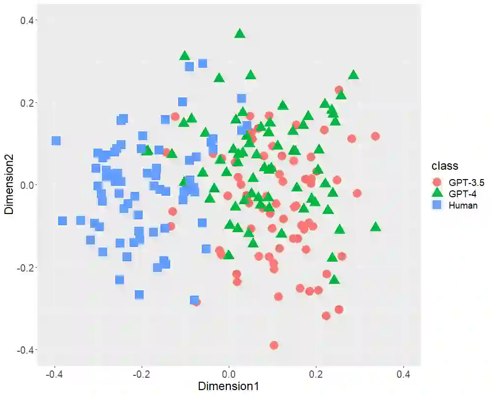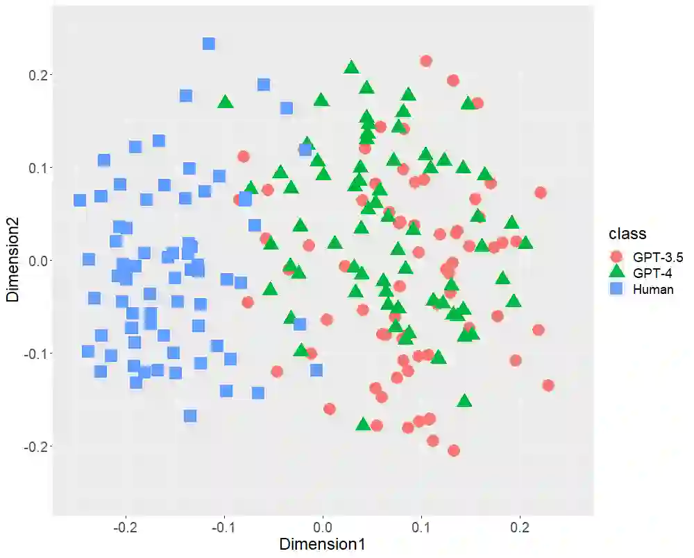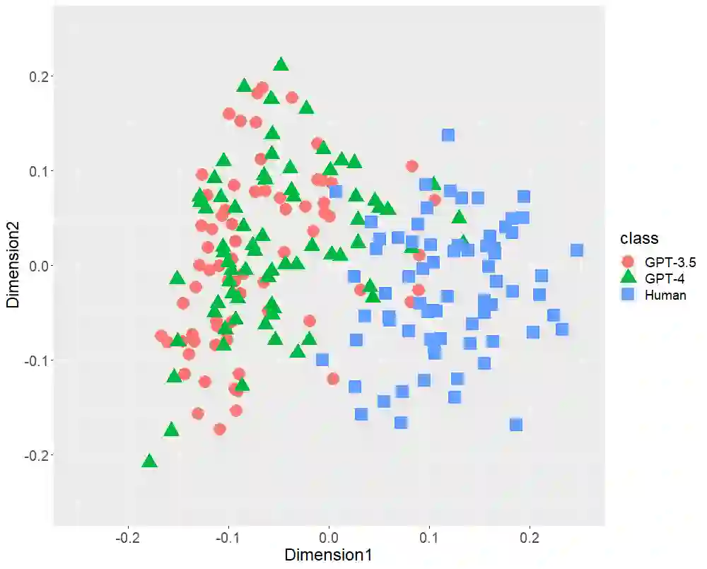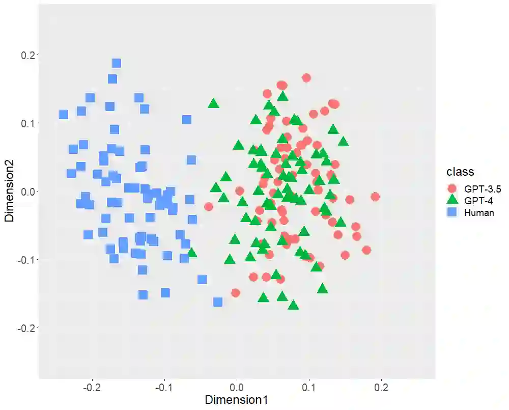 翻译:文本生成的人工智能(ChatGPT),包括OpenAI的GPT-3.5和GPT-4,已经在全球范围内引起了极大的关注。本研究首先比较了由GPT(-3.5和-4)生成的日语文体特征和人类写作的文体特征。本研究采用多维缩放(MDS)分析来确认三类216篇文本(36位单一作者撰写的72篇学术论文、基于前述论文标题生成的72篇GPT-3.5文本和72篇GPT-4文本)的分布情况,侧重以下文体特征: (1) 词性二元组,(2) 助词二元组,(3) 逗号位置,和 (4) 功能词比率。MDS 揭示了 GPT(-3.5和-4)生成文本和人类写作文本在每个文体特征上都有明显不同的分布。虽然 GPT-4 比 GPT-3.5 功率更大,因为它具有更多的参数,但是 GPT(-3.5和-4) 的分布可能会发生重叠。这些结果表明虽然未来参数数量可能会增加,但是在文体特征方面,人工智能生成的文本可能与人类撰写的文本不会接近。其次,我们通过随机森林(RF)分类器验证了以文体特征为中心的两类(GPT和人类)分类性能,本研究揭示了每种文体特征的高性能RF分类器。此外,以功能词比率为中心的RF分类器达到98.1%的准确率,以全部文体特征为中心的RF分类器在所有性能指标(准确率、召回率、精确率和 F1 分数)上达到了100%。本研究的结论是,在目前这个阶段,以日语为例,我们人类可以区分 ChatGPT 和人类撰写的文本。