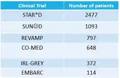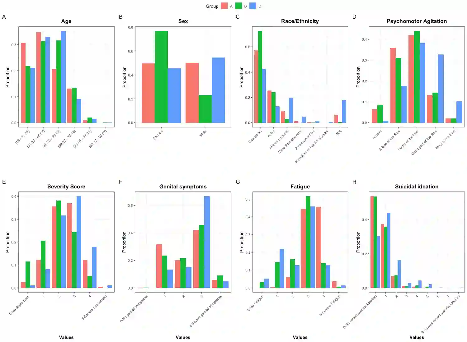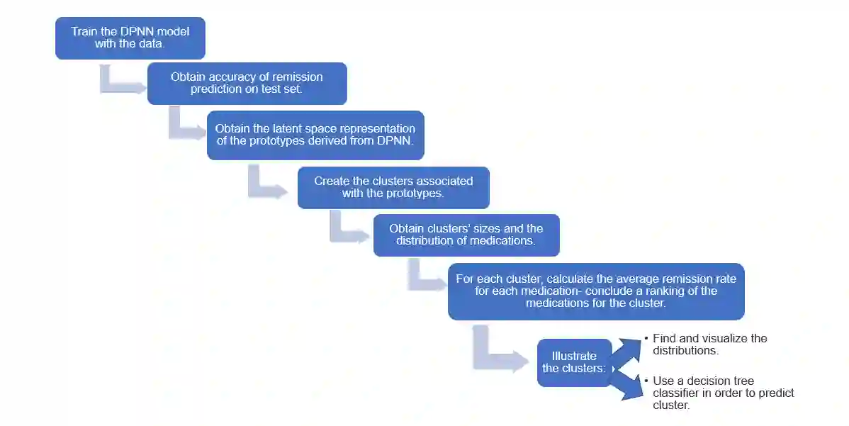翻译:抑郁症是一种异质性疾病,多种潜在的神经生物学基础可能与治疗反应的变异有关。了解这种变异的来源并预测结果一直是困难的。机器学习在预测MDD治疗反应方面显示出了潜力,但其局限性在于机器学习模型的临床可解释性不足。我们利用差异原型神经网络(DPNN)分析了6个药物治疗抑郁症的临床试验数据(总样本量n = 5438),这是一种神经网络模型,它可以得出治疗相关的患者集簇,同时学习生成差异性治疗反应的概率,其中利用了辅助性临床和基本数据信息。我们使用这个模型训练了一个分类缓解的模型,并对五种一线单药和三种联合治疗进行个体缓解概率输出。根据曲线下面积(AUC)和模型引导治疗中预期的人群缓解率提高来测量模型的有效性和临床效用。后续分析利用了在训练期间学习的患者原型产生集群(亚群)。通过评估特征分布和治疗特异性结果之间的差异,评估了原型的可解释性。一个3-原型模型达到了0.66的AUC和对人口缓解率的预期绝对提高,这些结果比样本缓解率高。我们确定了三个与治疗相关的患者集群,它们在临床上是可解释的。使用机器学习模型可以生成新的与治疗相关的患者配置文件,这可能改善抑郁症的精准医学。注意:该模型当前不是任何主动临床试验的研究对象,也不是用于临床目的的。