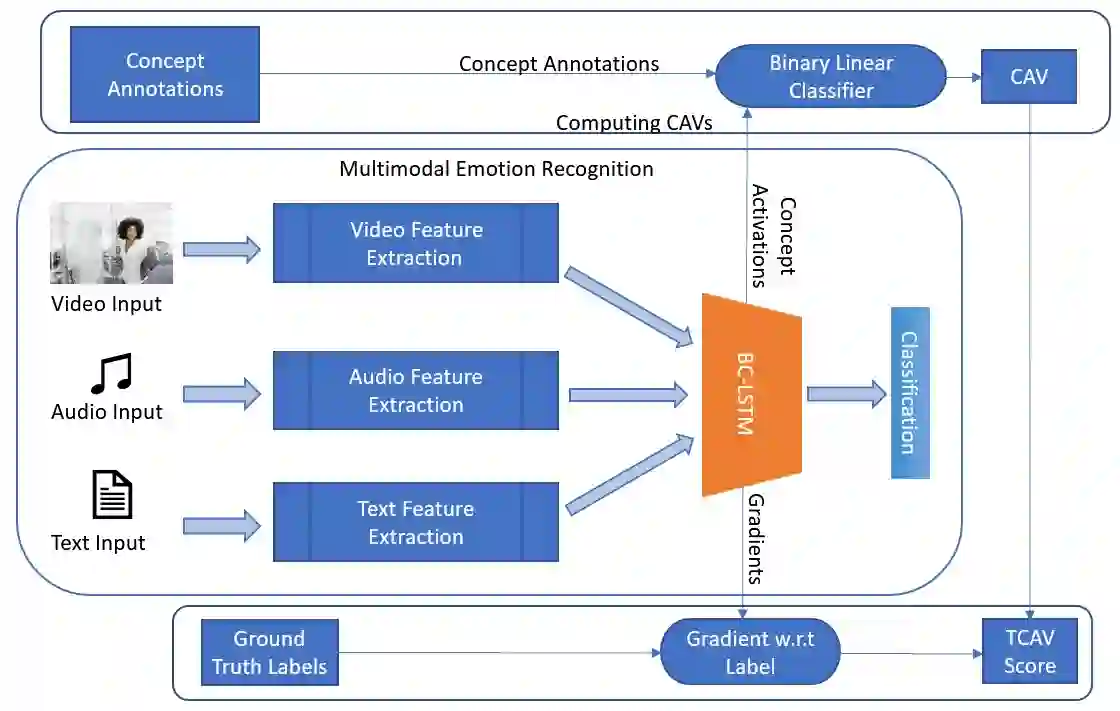 翻译:多式情感认知是指将输入视频序列分类为基于多种输入模式(通常是视频、音频和文字)的情感标签。近年来,深神经网络在识别人类情感方面表现出了显著的成绩,并且与人类在这项任务方面的表现相当。尽管最近在这一领域取得了进步,但由于其推理和决策过程的模糊性质,情感识别系统尚未被现实世界设置所接受。这个领域的研究大多涉及改进这项任务绩效的新结构,很少尝试为这些模型的决定提供解释。在本文件中,我们讨论了在使用概念动因矢量(CAVs)来识别情感背景下神经网络的可解释性问题。为了分析模型的潜在空间,我们定义了情感AI所特有的人类可理解概念,并将这些概念映射到广泛使用的 IEMOCAP 多式联运数据库中。然后,我们评估了我们提出的概念在双向背景LSTM(BC-LSTM)网络多个层次上的影响,以显示这些模型的逻辑网络在通过概念识别情感认同的神经网络的推理过程中,我们最后可以代表着这种可理解性概念。