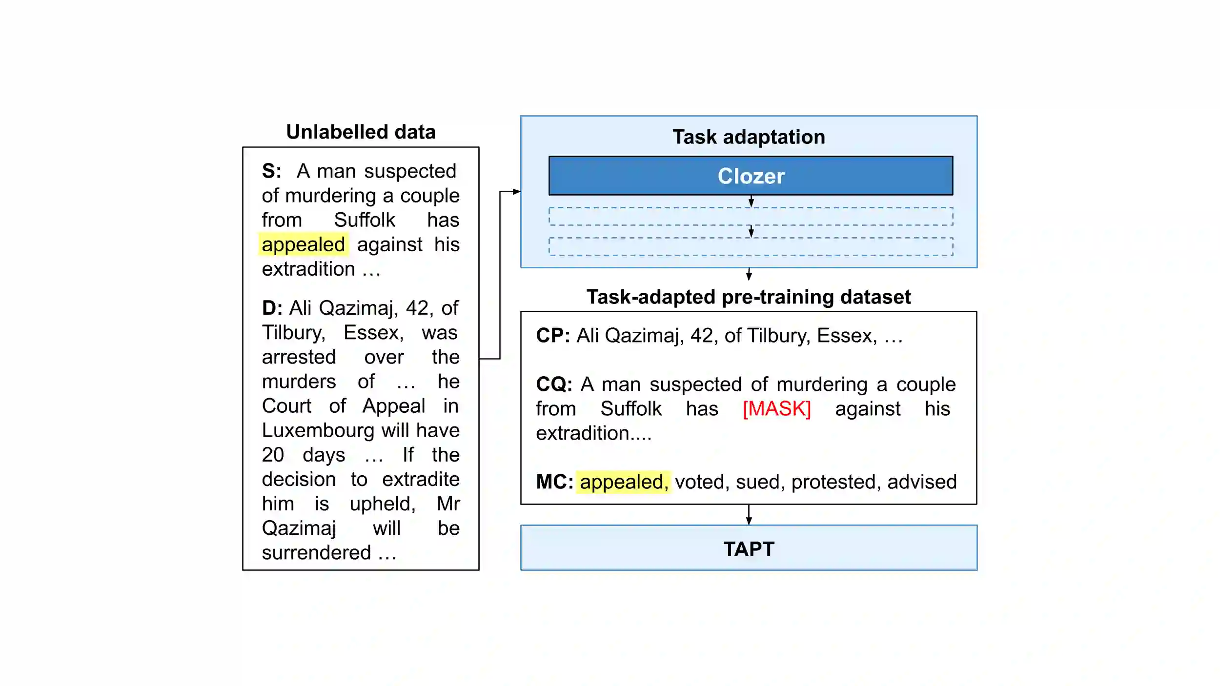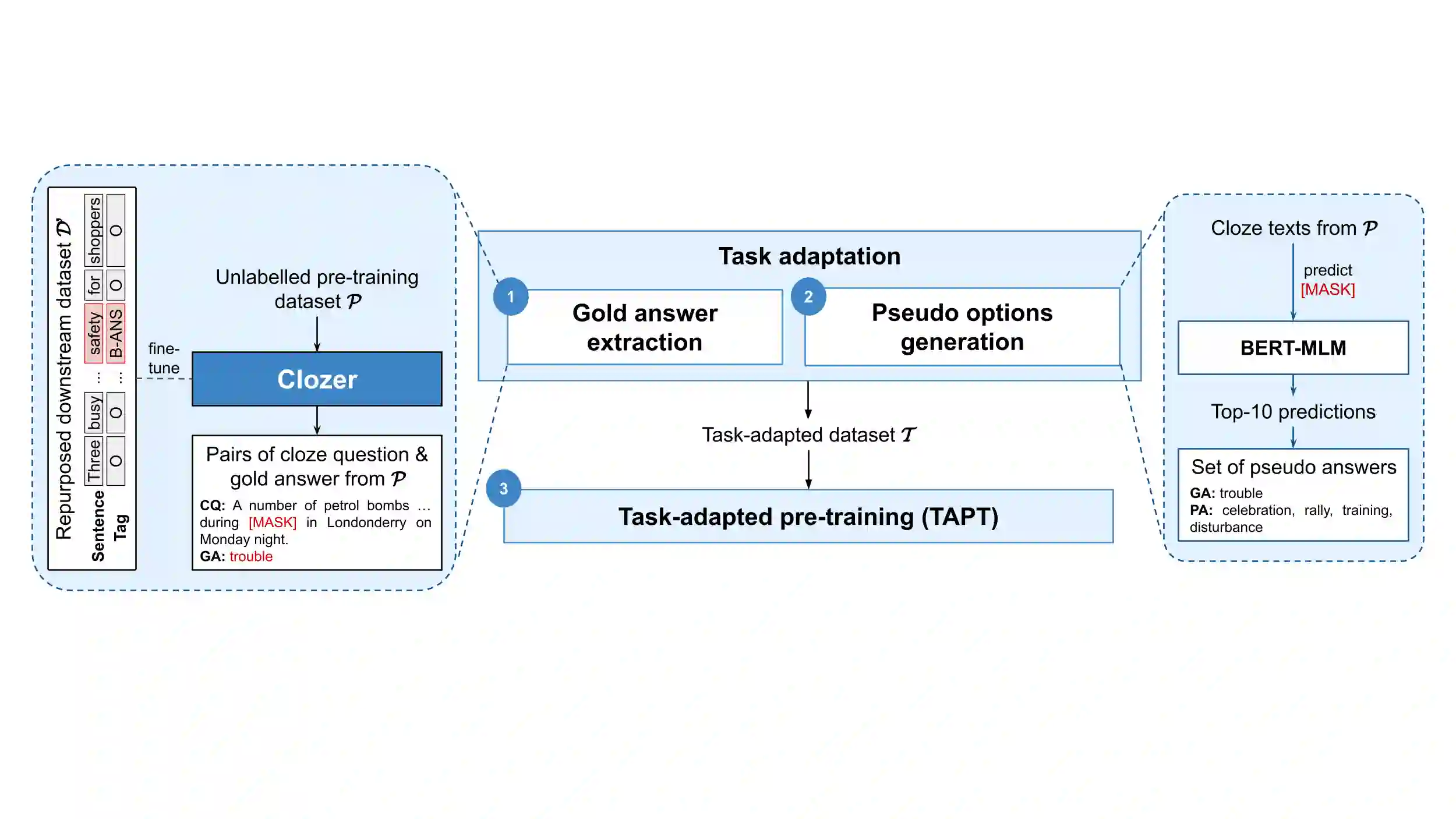 Task-adaptive pre-training (TAPT) alleviates the lack of labelled data and provides performance lift by adapting unlabelled data to downstream task. Unfortunately, existing adaptations mainly involve deterministic rules that cannot generalize well. Here, we propose Clozer, a sequence-tagging based cloze answer extraction method used in TAPT that is extendable for adaptation on any cloze-style machine reading comprehension (MRC) downstream tasks. We experiment on multiple-choice cloze-style MRC tasks, and show that Clozer performs significantly better compared to the oracle and state-of-the-art in escalating TAPT effectiveness in lifting model performance, and prove that Clozer is able to recognize the gold answers independently of any heuristics.