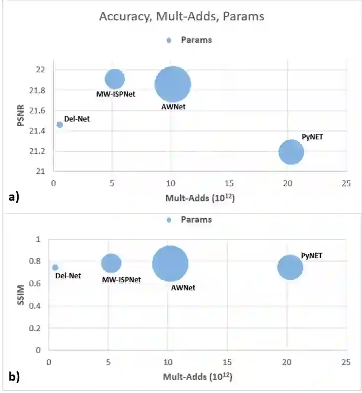 翻译:智能手机摄取图像的质量是一项重要规格,因为智能手机作为主要捕捉装置正在变得无处不在,因此智能手机拍摄的图像信号处理(ISP)传统管道在智能手机摄像机中的传统图像处理(ISP)管道质量有限,包括从原始传感器数据中按顺序进行的若干图像处理步骤,以重建高质量的SRGB图像。这些步骤包括演示、脱色、白平衡、伽马校正、彩色增强等。由于每个步骤都是按顺序使用手动算法进行的,每个处理模块的剩余误差在最后重建的信号中积累。因此,传统的ISP管道在各种照明条件和相关噪音水平的通用性方面,重建质量有限。使用革命性神经网络(CNN)的深层学习方法,在解决许多与图像有关的任务时变得很受欢迎,例如图像解析、对比增强、超分辨率解析、分解等。 此外,最近使用深层学习方法对SRGBB转换的系统转换方法,也在最后重建信号中积累了它们的记忆要求和Mult-Add路段数量方面都限制了重建质量质量,同时捕捉取图像。