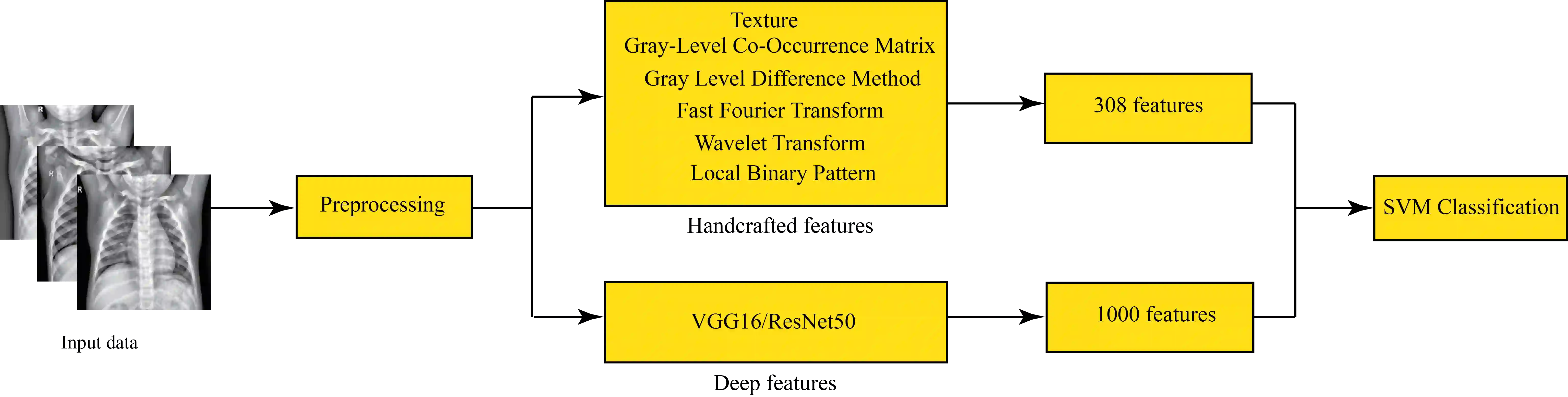 Coronavirus Disease 2019 (COVID-19) demonstrated the need for accurate and fast diagnosis methods for emergent viral diseases. Soon after the emergence of COVID-19, medical practitioners used X-ray and computed tomography (CT) images of patients' lungs to detect COVID-19. Machine learning methods are capable of improving the identification accuracy of COVID-19 in X-ray and CT images, delivering near real-time results, while alleviating the burden on medical practitioners. In this work, we demonstrate the efficacy of a support vector machine (SVM) classifier, trained with a combination of deep convolutional and handcrafted features extracted from X-ray chest scans. We use this combination of features to discriminate between healthy, common pneumonia, and COVID-19 patients. The performance of the combined feature approach is compared with a standard convolutional neural network (CNN) and the SVM trained with handcrafted features. We find that combining the features in our novel framework improves the performance of the classification task compared to the independent application of convolutional and handcrafted features. Specifically, we achieve an accuracy of 0.988 in the classification task with our combined approach compared to 0.963 and 0.983 accuracy for the handcrafted features with SVM and CNN respectively.