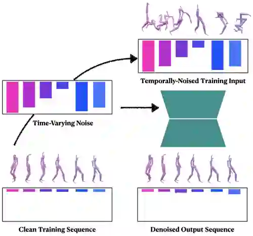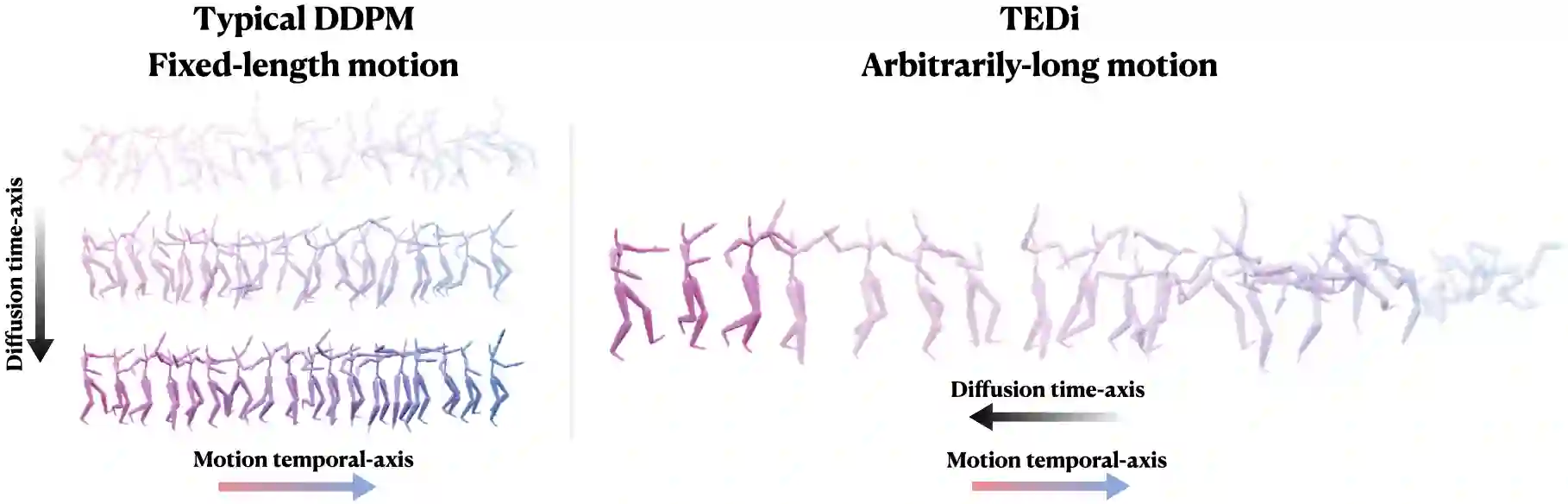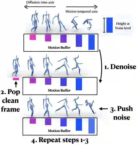 The gradual nature of a diffusion process that synthesizes samples in small increments constitutes a key ingredient of Denoising Diffusion Probabilistic Models (DDPM), which have presented unprecedented quality in image synthesis and been recently explored in the motion domain. In this work, we propose to adapt the gradual diffusion concept (operating along a diffusion time-axis) into the temporal-axis of the motion sequence. Our key idea is to extend the DDPM framework to support temporally varying denoising, thereby entangling the two axes. Using our special formulation, we iteratively denoise a motion buffer that contains a set of increasingly-noised poses, which auto-regressively produces an arbitrarily long stream of frames. With a stationary diffusion time-axis, in each diffusion step we increment only the temporal-axis of the motion such that the framework produces a new, clean frame which is removed from the beginning of the buffer, followed by a newly drawn noise vector that is appended to it. This new mechanism paves the way towards a new framework for long-term motion synthesis with applications to character animation and other domains.