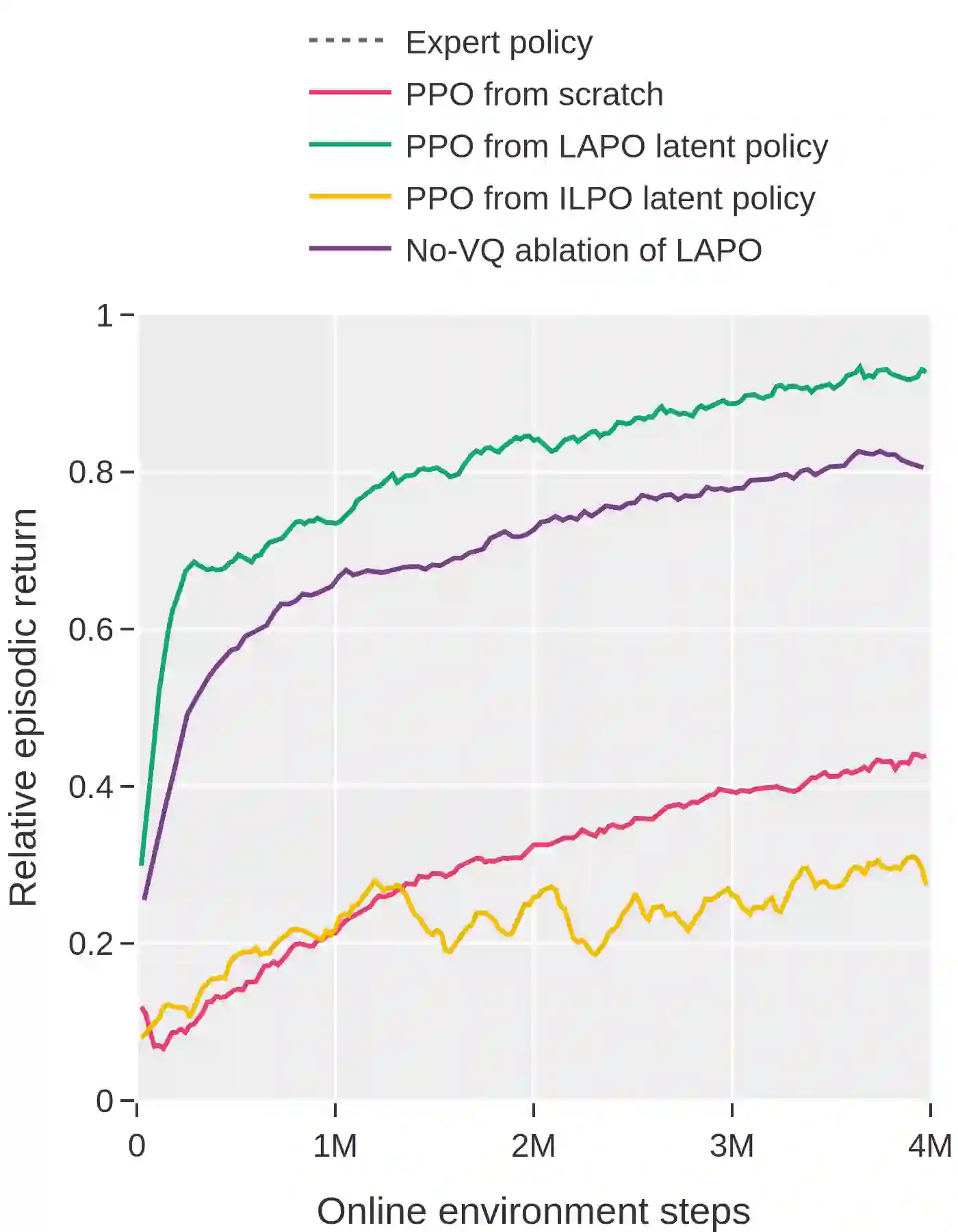 Pre-training large models on vast amounts of web data has proven to be an effective approach for obtaining powerful, general models in several domains, including language and vision. However, this paradigm has not yet taken hold in deep reinforcement learning (RL). This gap is due to the fact that the most abundant form of embodied behavioral data on the web consists of videos, which do not include the action labels required by existing methods for training policies from offline data. We introduce Latent Action Policies from Observation (LAPO), a method to infer latent actions and, consequently, latent-action policies purely from action-free demonstrations. Our experiments on challenging procedurally-generated environments show that LAPO can act as an effective pre-training method to obtain RL policies that can then be rapidly fine-tuned to expert-level performance. Our approach serves as a key stepping stone to enabling the pre-training of powerful, generalist RL models on the vast amounts of action-free demonstrations readily available on the web.