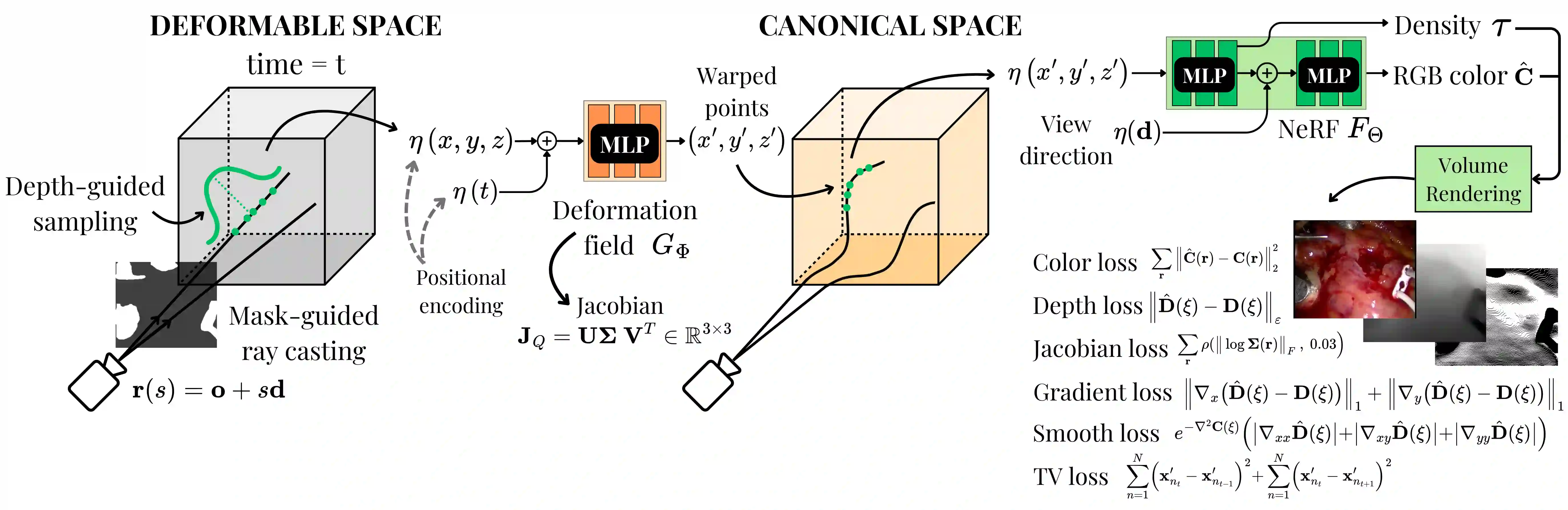 翻译:内窥镜成像是医学影像中不可或缺的技术,广泛应用于诊断、预后评估与治疗。为内窥镜视频开发鲁棒的动态三维重建流程,能够增强可视化效果、提升诊断准确性、辅助治疗规划并指导手术操作。然而,由于组织的可变形特性、单目相机的使用、光照变化、遮挡以及未知的相机轨迹,该任务面临诸多挑战。受神经渲染技术的启发,我们提出了NeRFscopy——一种基于单目视频实现可变形内窥镜组织新视角合成与三维重建的自监督流程。NeRFscopy包含一个由规范辐射场和基于SE(3)变换参数化的时变形变场构成的可变形模型。此外,通过引入精细化的约束项,系统能够高效利用彩色图像数据,在不依赖任何预设模板或预训练模型的情况下,仅从数据中学习三维隐式表示。NeRFscopy在新视角合成方面取得了精确的结果,在多种具有挑战性的内窥镜场景中均优于现有方法。