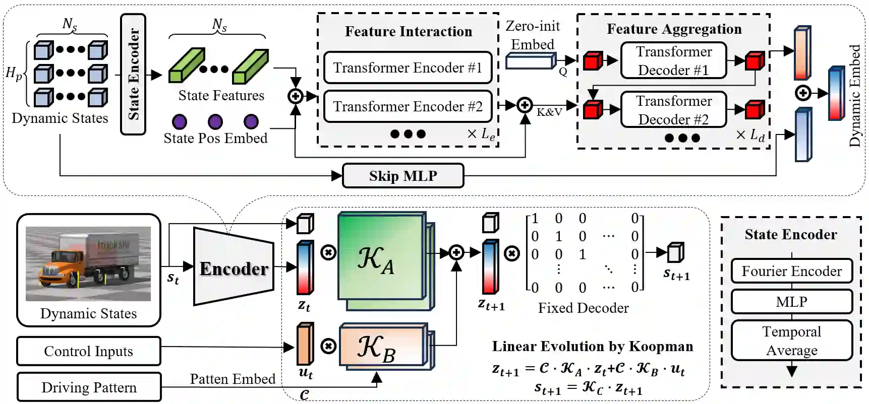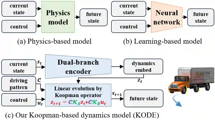 翻译:先进的自动驾驶系统需要精确的车辆动力学建模。然而,由于强烈的非线性以及纵向与横向动力学特性的耦合,识别精确的动力学模型仍然具有挑战性。先前的研究采用基于物理的分析模型或神经网络来构建车辆动力学表征。然而,这些方法往往难以在系统辨识效率、建模精度以及与线性控制策略的兼容性方面同时取得令人满意的性能。本文针对复杂的分布式电驱卡车,提出了一种完全数据驱动的动力学建模方法,该方法利用库普曼算子理论在提升的线性嵌入空间中表示高度非线性的动力学。为实现高精度建模,我们首先提出了一种新颖的双分支编码器,用于编码动力学状态,并为所提出的基于库普曼的方法(命名为KODE)提供强大的基函数。一种基于时序车辆运动几何一致性的物理信息监督机制被纳入训练过程,以促进编码器和库普曼算子的有效学习。此外,为适应分布式电驱卡车的多样化驾驶模式,我们将基础的库普曼算子扩展为混合库普曼算子框架,从而增强了建模能力。在高保真TruckSim环境中进行的仿真以及真实世界实验表明,所提出的方法在长期动力学状态估计方面达到了最先进的性能。