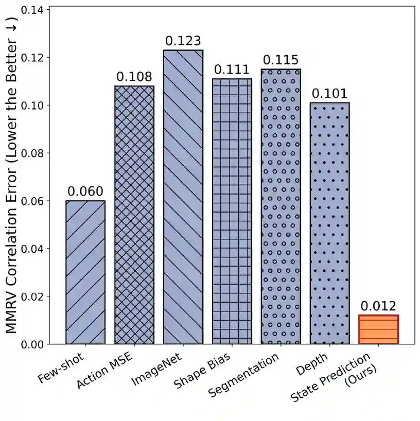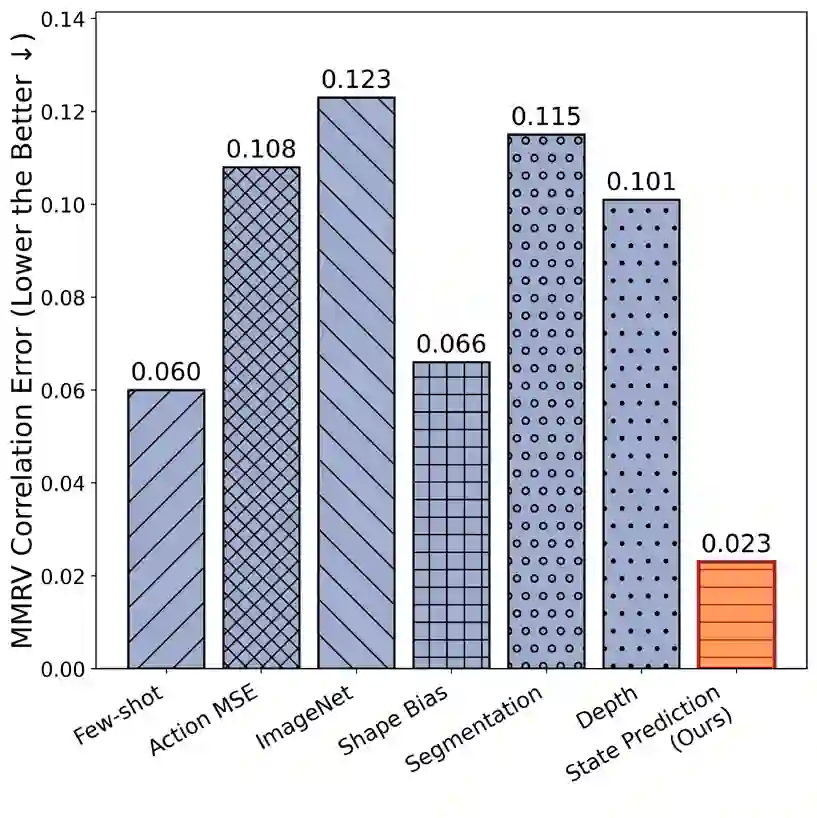 翻译:视觉表征的选择对于扩展通用机器人策略至关重要。然而,即使是在仿真环境中,通过策略部署进行直接评估的成本也十分高昂。现有的代理指标主要关注表征捕捉视觉世界局部特征(如物体形状)的能力,这限制了其在不同环境间的泛化能力。本文采用分析视角:我们通过测量预训练视觉编码器从图像中解码环境状态(包括几何结构、物体结构和物理属性)的能力来探究其特性。利用能够获取真实状态数据的仿真环境,我们证明这种探测精度与多种环境和学习设置下的下游策略性能高度相关,显著优于现有指标,并实现了高效的表征选择。更广泛而言,我们的研究揭示了支持可泛化操作的表示特性,表明学习编码环境的潜在物理状态是实现控制的一个有前景的目标。