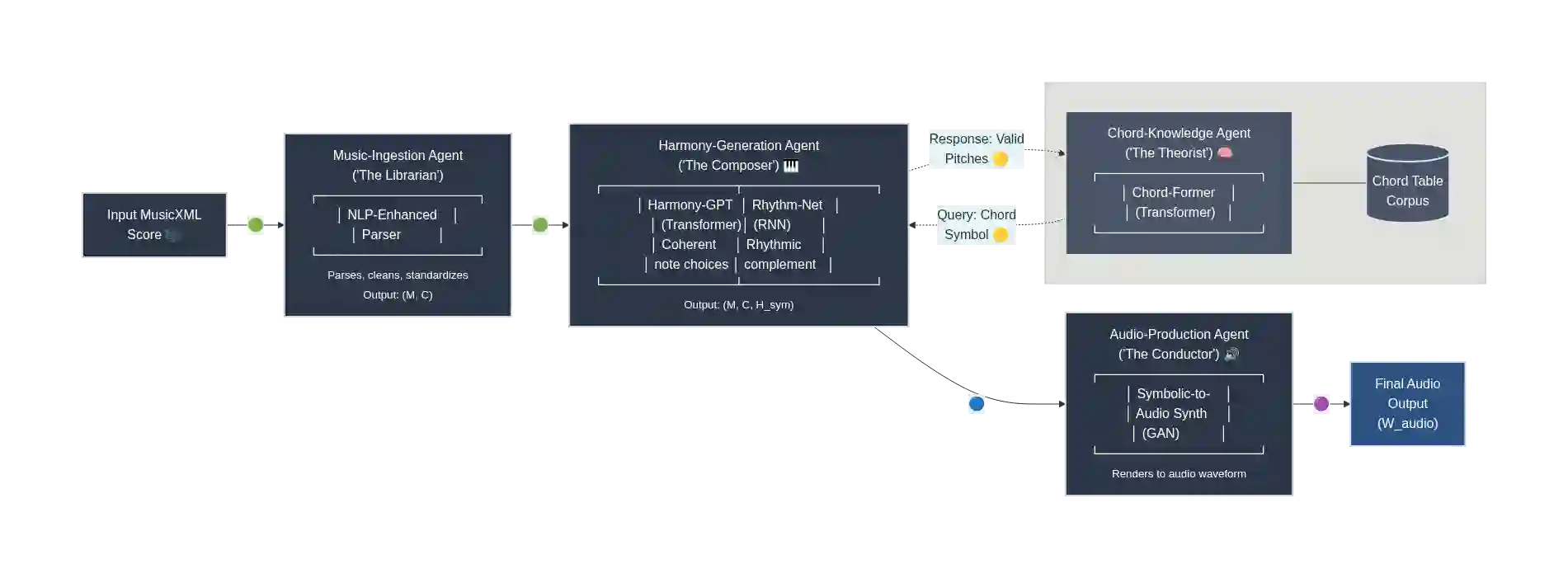 翻译:在算法作曲领域,生成具有音乐连贯性和美学愉悦性的和声仍然是一项重大挑战。本文介绍了一种创新的、基于智能体人工智能的高声部和声音乐生成器,这是一个设计用于以协作和模块化方式创建和声的多智能体系统。我们的框架包含四个专门化智能体:一个用于解析和标准化输入乐谱的音乐摄取智能体;一个由Chord-Former(Transformer模型)驱动的和弦知识智能体,用于解释并提供复杂和弦符号的组成音符;一个和声生成智能体,它利用Harmony-GPT和Rhythm-Net(RNN)来创作一条在旋律和节奏上互补的和声线条;以及一个音频制作智能体,它采用基于GAN的符号到音频合成器,将最终的符号输出渲染为高保真音频。通过将特定任务委托给专门化智能体,我们的系统有效地模拟了人类音乐家的协作过程。这种模块化、基于智能体的方法实现了稳健的数据处理、深入的理论理解、创造性作曲和逼真的音频合成,最终形成一个能够为给定旋律生成复杂且符合语境的高声部和声的系统。
