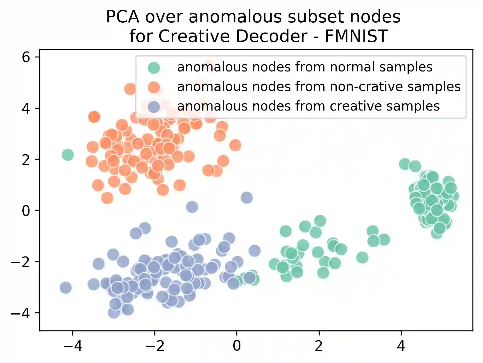 Deep generative models, such as Variational Autoencoders (VAEs), have been employed widely in computational creativity research. However, such models discourage out-of-distribution generation to avoid spurious sample generation, limiting their creativity. Thus, incorporating research on human creativity into generative deep learning techniques presents an opportunity to make their outputs more compelling and human-like. As we see the emergence of generative models directed to creativity research, a need for machine learning-based surrogate metrics to characterize creative output from these models is imperative. We propose group-based subset scanning to quantify, detect, and characterize creative processes by detecting a subset of anomalous node-activations in the hidden layers of generative models. Our experiments on original, typically decoded, and "creatively decoded" (Das et al 2020) image datasets reveal that the proposed subset scores distribution is more useful for detecting creative processes in the activation space rather than the pixel space. Further, we found that creative samples generate larger subsets of anomalies than normal or non-creative samples across datasets. The node activations highlighted during the creative decoding process are different from those responsible for normal sample generation.