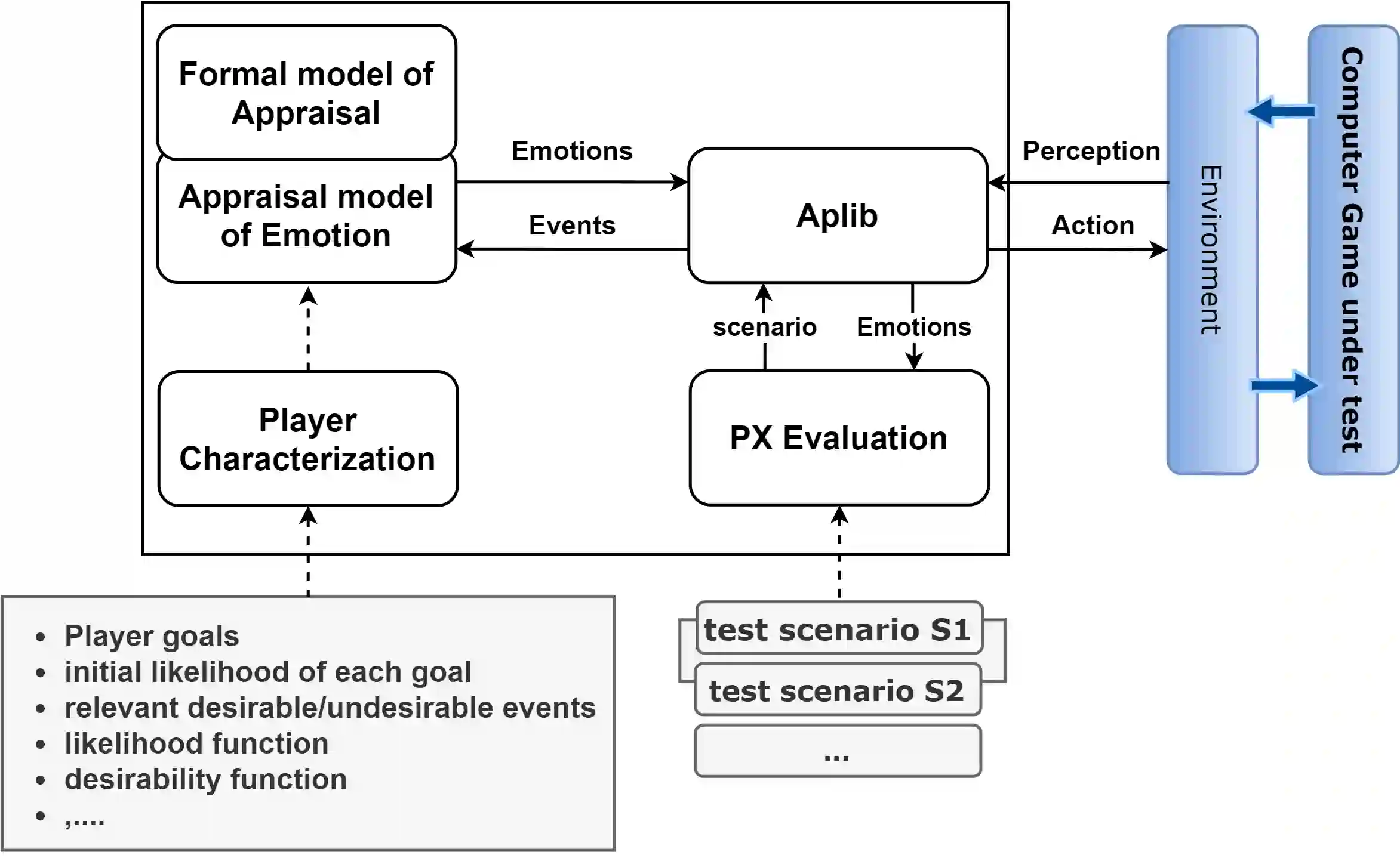 翻译:玩家体验( PX) 评估已经成为游戏行业感兴趣的领域。 已经引入了几种手动 PX 技术来帮助开发者理解和评估玩家在计算机游戏中的经验。 但是,仍然需要解决玩家体验的自动测试。 一个自动玩家体验测试框架将允许设计者在早期开发阶段评估PX要求,而无需参与人类玩家参与。 在本文中,我们建议一种基于事件情绪的正式模式来自动玩家体验测试方法。 特别是, 我们讨论一个基于事件的过渡系统, 用Ortony、Clore、 & Collins(OCC) 的情感理论来将相关的情感正规化。 该模型的工作原型在Aplib(战术代理编程库)的顶部上整合,以创建智能的 PX 测试剂, 能够在3D 游戏案例研究中评估情绪。 其结果被用图形显示为热图。 测试代理的情感直观化最终将有助于游戏设计者创造在玩家中产生一定经验的内容。