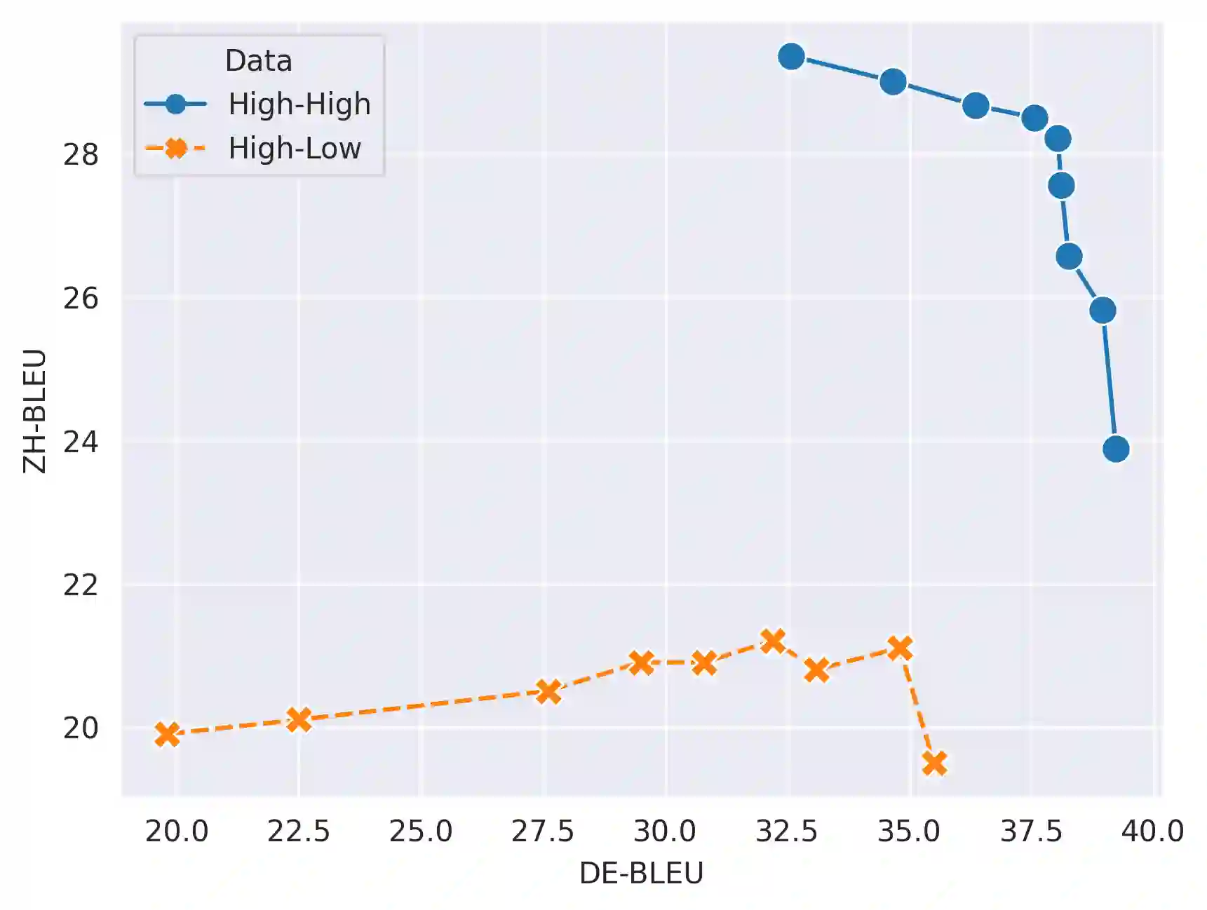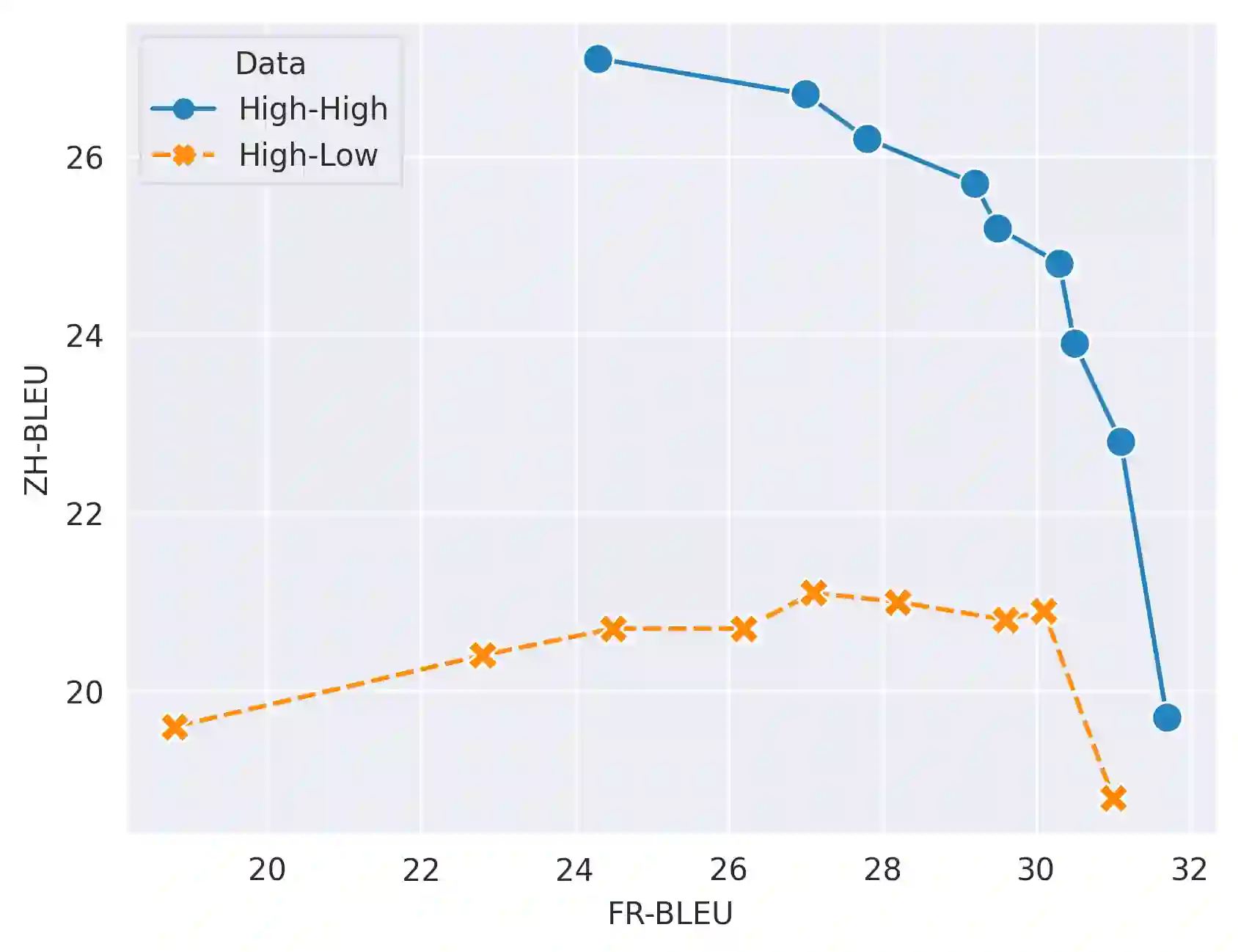 翻译:在这项工作中,我们研究了给定方向的广义性能如何随其采样比例在多语言神经机器翻译(MNMT)中改变。通过训练超过200个具有各种模型大小,方向和任务总数的多语言模型,我们发现当训练语料库中存在数据不平衡时,标量化会导致多任务折衷前沿偏离传统的帕累托前沿。也就是说,对于某些翻译方向的性能不随其在多任务优化目标中的权重增加而提高,这对于提高所有方向的整体性能提出了更大的挑战。基于我们的观察,我们提出了双幂律以预测MNMT中的独特性能折衷前沿,该前沿在各种语言,数据充足性和任务数量方面都具有鲁棒性。最后,我们将MNMT中的采样比例选择建模为基于双幂律的优化问题,在我们的实验中使用的训练预算的一半以内,其性能优于温度搜索和梯度操作方法。