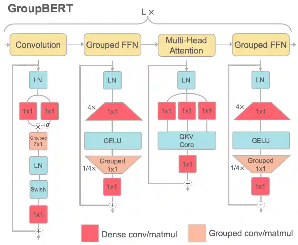 Attention based language models have become a critical component in state-of-the-art natural language processing systems. However, these models have significant computational requirements, due to long training times, dense operations and large parameter count. In this work we demonstrate a set of modifications to the structure of a Transformer layer, producing a more efficient architecture. First, we add a convolutional module to complement the self-attention module, decoupling the learning of local and global interactions. Secondly, we rely on grouped transformations to reduce the computational cost of dense feed-forward layers and convolutions, while preserving the expressivity of the model. We apply the resulting architecture to language representation learning and demonstrate its superior performance compared to BERT models of different scales. We further highlight its improved efficiency, both in terms of floating-point operations (FLOPs) and time-to-train.