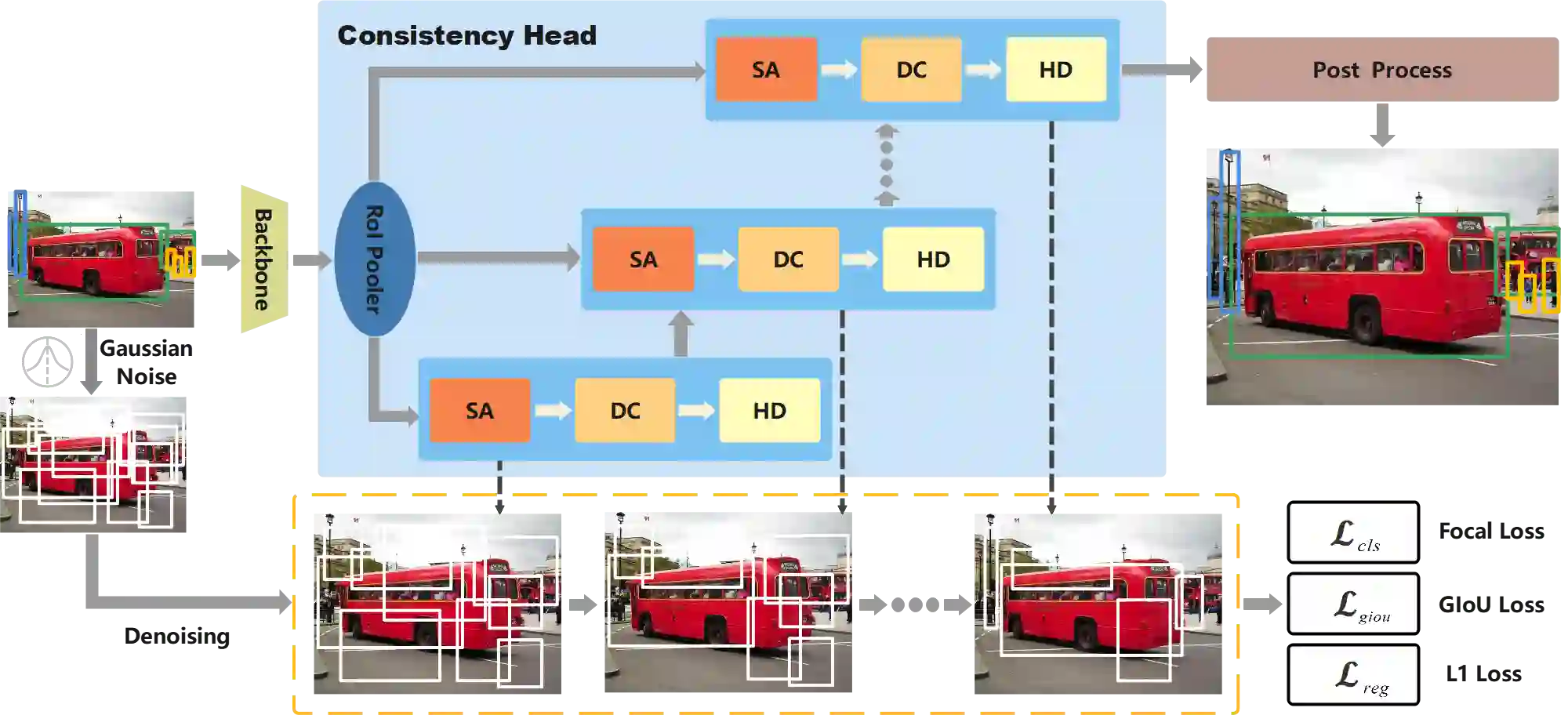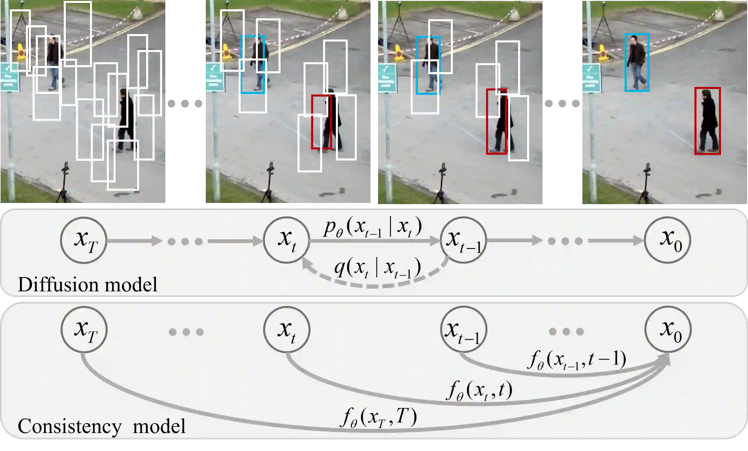 翻译:目标检测作为感知计算领域的核心任务,可采用生成式方法进行求解。本研究提出一种新颖框架,将目标检测表述为针对标注实体扰动边界框的去噪扩散过程。该框架名为 **ConsistencyDet**,其核心创新在于采用了一种称为一致性模型的去噪范式。该模型具备自一致性特性,能够将任意时间步的失真信息映射回原始状态,从而实现 **"少步去噪"** 机制。这一特性显著提升了模型运行效率,与传统扩散模型形成鲜明区别。在训练阶段,ConsistencyDet 从真实标注添加噪声的边界框开始扩散序列,并通过条件约束训练模型执行去噪任务。在推理阶段,模型采用从正态分布随机采样的边界框作为起点,通过迭代优化将随机生成的候选框逐步精炼为最终检测结果。基于 MS-COCO 和 LVIS 等标准基准的全面实验表明,ConsistencyDet 在性能指标上超越了其他前沿检测器。我们的代码公开于 https://anonymous.4open.science/r/ConsistencyDet-37D5。