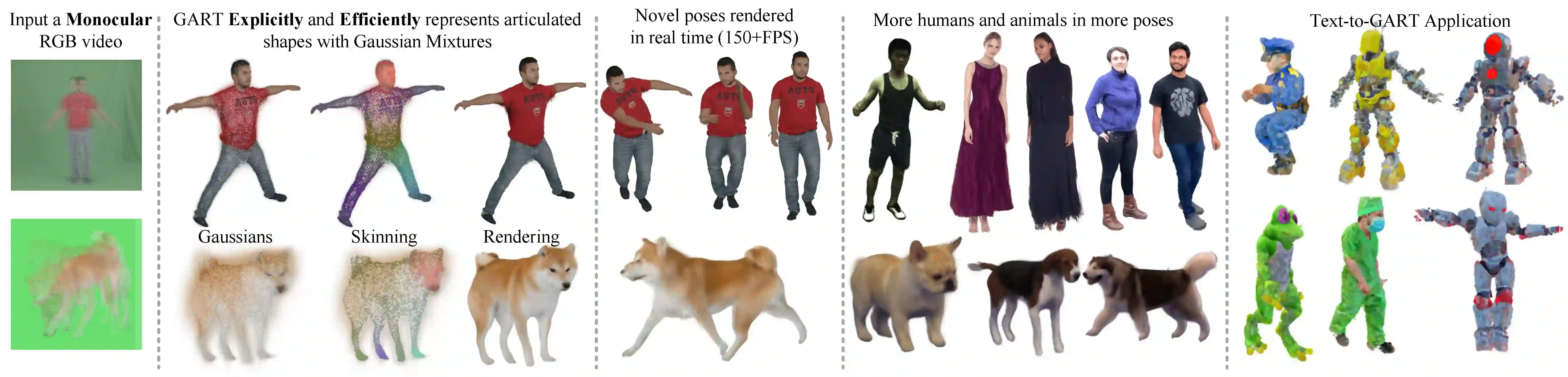 We introduce Gaussian Articulated Template Model GART, an explicit, efficient, and expressive representation for non-rigid articulated subject capturing and rendering from monocular videos. GART utilizes a mixture of moving 3D Gaussians to explicitly approximate a deformable subject's geometry and appearance. It takes advantage of a categorical template model prior (SMPL, SMAL, etc.) with learnable forward skinning while further generalizing to more complex non-rigid deformations with novel latent bones. GART can be reconstructed via differentiable rendering from monocular videos in seconds or minutes and rendered in novel poses faster than 150fps.