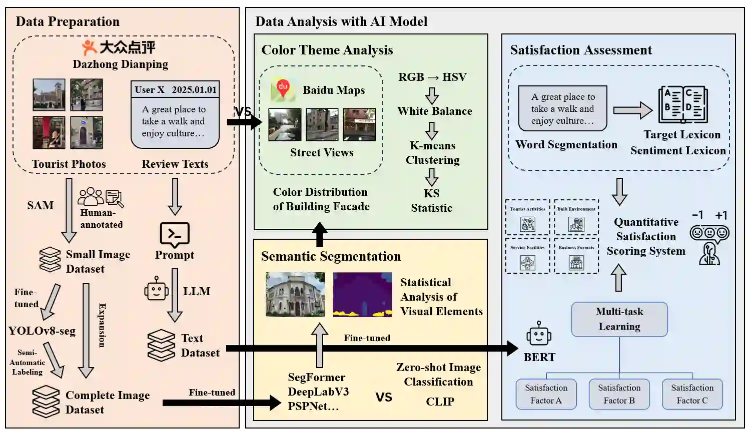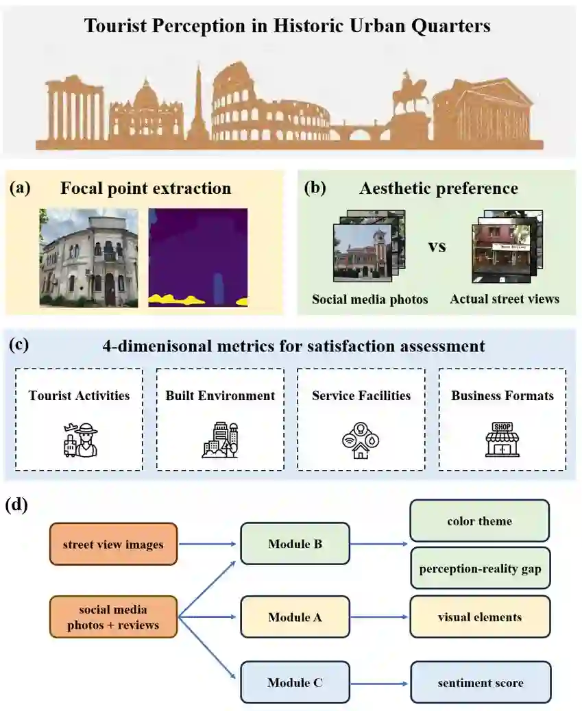 翻译:历史城区在保护文化遗产的同时,作为旅游与日常生活的活跃空间发挥着至关重要的作用。理解游客如何感知这些环境对于实现可持续、以人为本的城市规划至关重要。本研究提出一个多维AI驱动框架,利用社交媒体多模态数据分析历史城区的游客感知。该框架应用于上海中心城区的十二个历史街区,整合了焦点提取、色彩主题分析和情感挖掘。通过微调的语义分割模型,从游客分享的照片中识别视觉关注区域。为评估审美偏好,采用聚类方法提取主导色彩,并分析其在不同街区的空间分布。进一步比较社交媒体照片与真实街景的色彩主题,揭示了显著差异。这种分歧凸显了视觉期望与建成环境之间的潜在差距,反映了风格偏好与感知偏差。通过结合基于规则的方法与多任务BERT模型的混合情感分析技术评估游客评论。满意度从四个维度进行评估:旅游活动、建成环境、服务设施与商业业态。结果揭示了审美吸引力与情感反应的空间异质性。本框架并非聚焦单一技术创新,而是提供了一种综合的、数据驱动的方法来解码游客感知,为旅游管理、遗产保护及具有美学吸引力的公共空间设计提供决策支持。