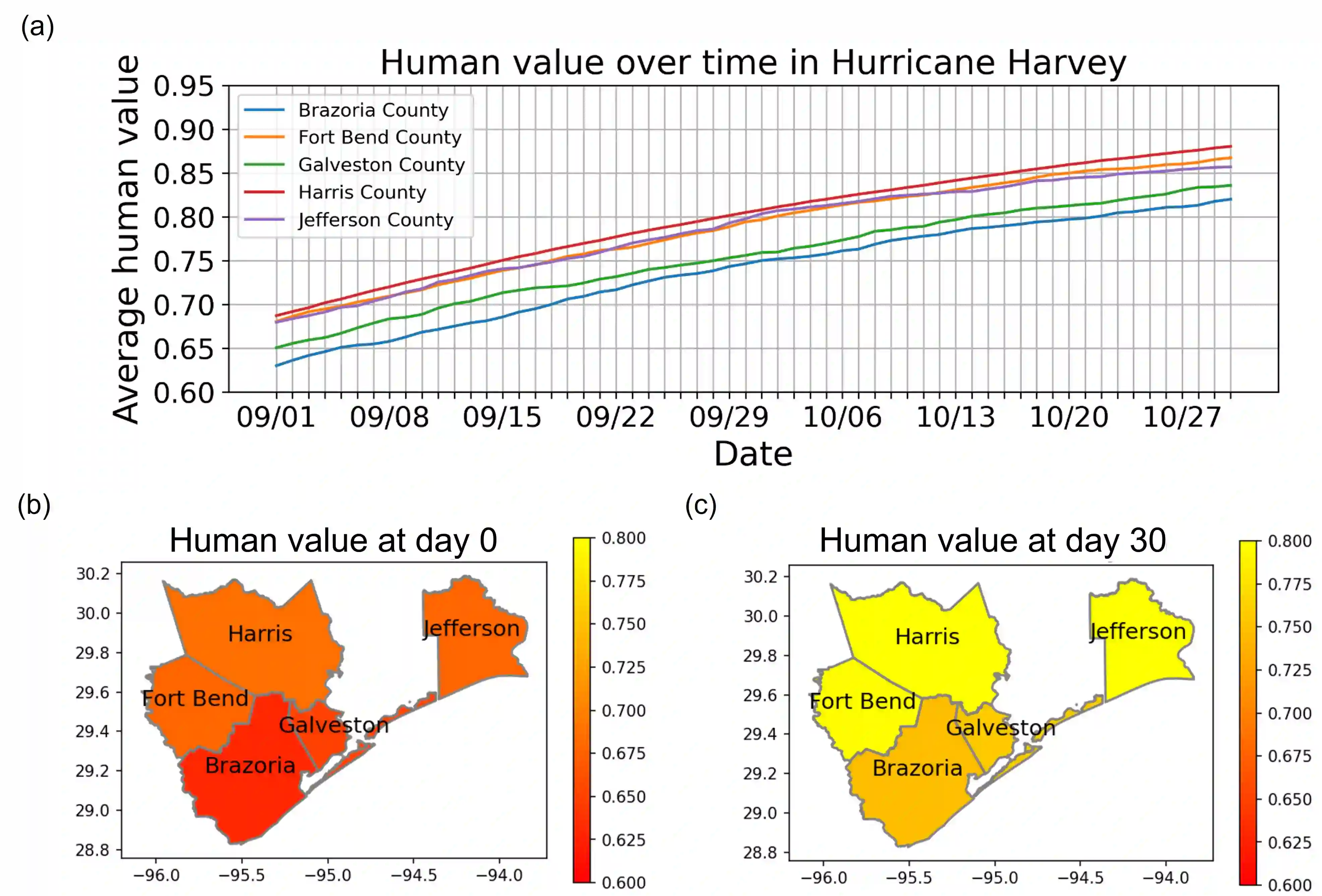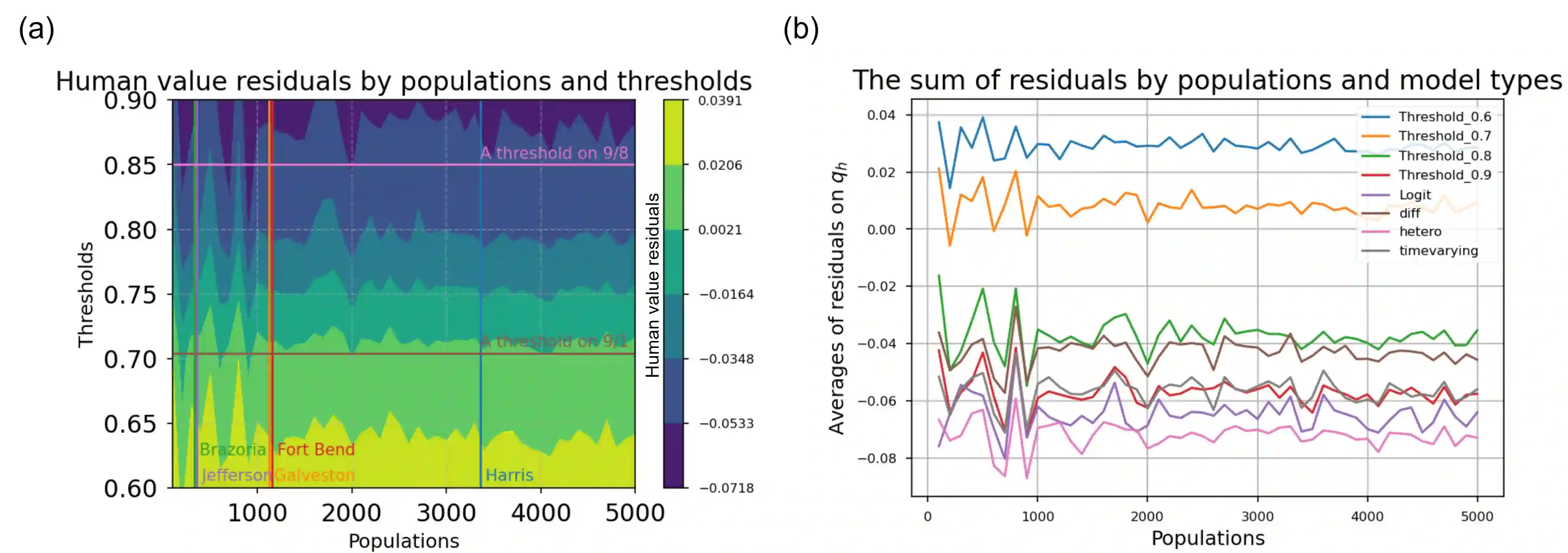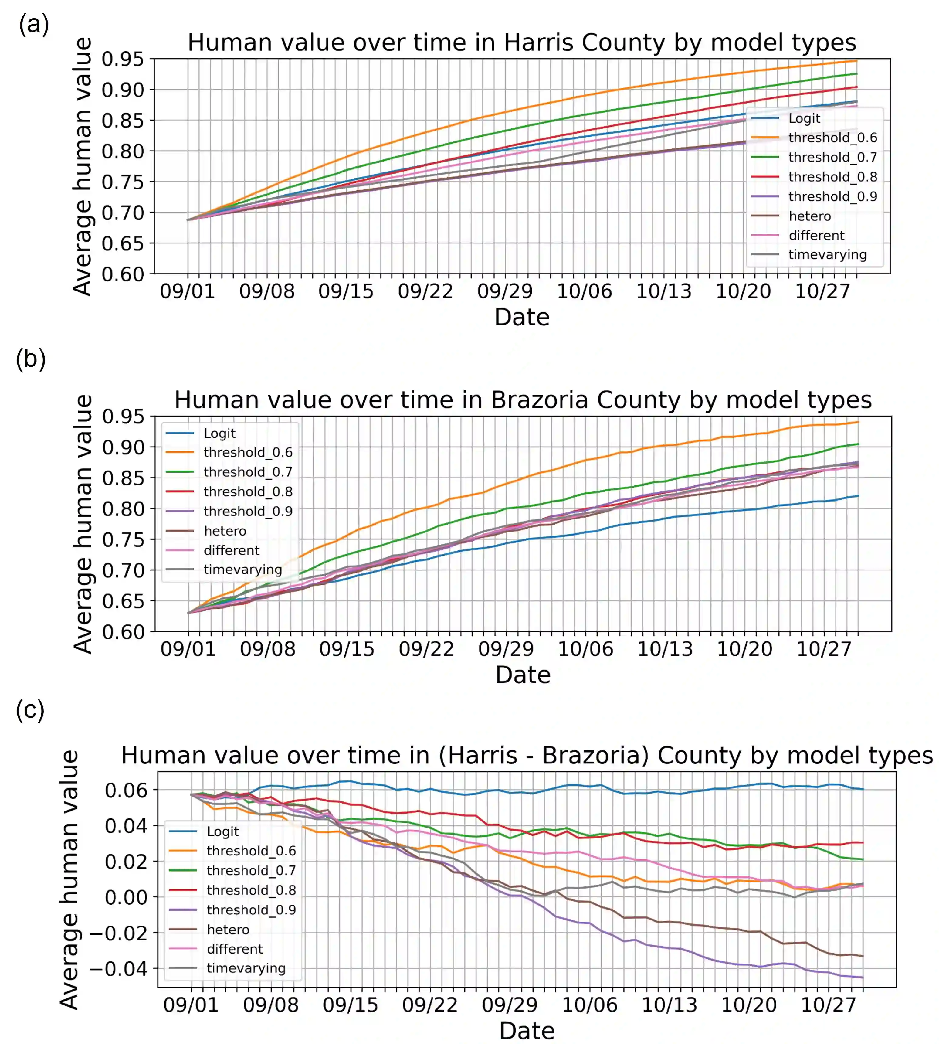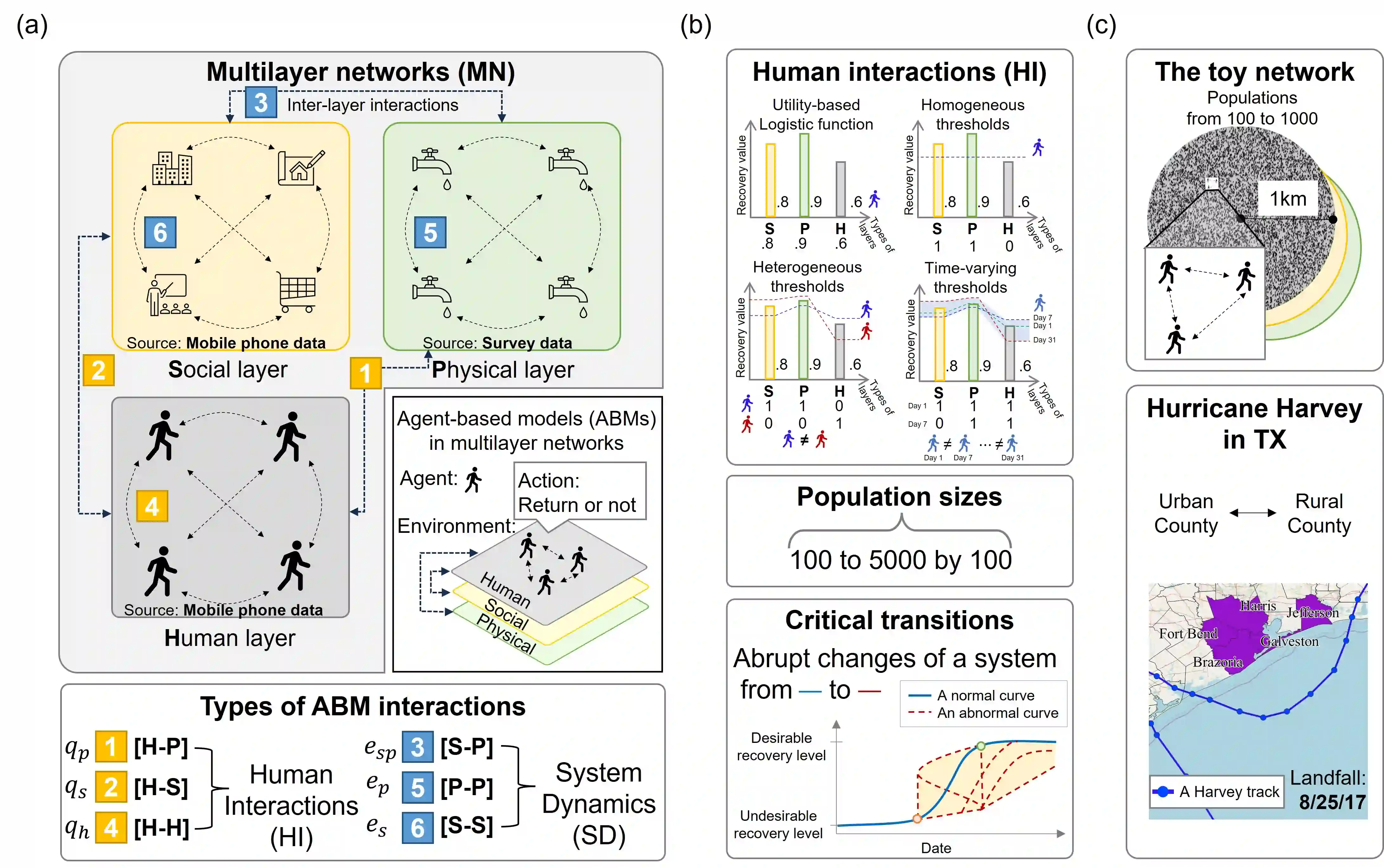 Frequent and intensive disasters make the repeated and uncertain post-disaster recovery process. Despite the importance of the successful recovery process, previous simulation studies on the post-disaster recovery process did not explore the sufficient number of household return decision model types, population sizes, and the corresponding critical transition conditions of the system. This paper simulates the recovery process in the agent-based model with multilayer networks to reveal the impact of household return decision model types and population sizes in a toy network. After that, this paper applies the agent-based model to the five selected counties affected by Hurricane Harvey in 2017 to check the urban-rural recovery differences by types of household return decision models. The agent-based model yields three conclusions. First, the threshold model can successfully substitute the binary logit model. Second, high thresholds and less than 1,000 populations perturb the recovery process, yielding critical transitions during the recovery process. Third, this study checks the urban-rural recovery value differences by different decision model types. This study highlights the importance of the threshold models and population sizes to check the critical transitions and urban-rural differences in the recovery process.