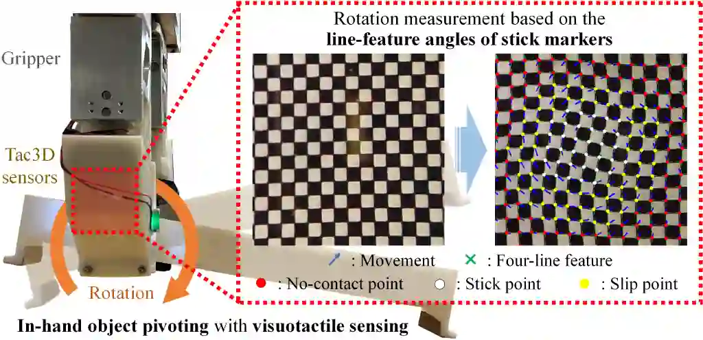 In typical in-hand manipulation tasks represented by object pivoting, the real-time perception of rotational slippage has been proven beneficial for improving the dexterity and stability of robotic hands. An effective strategy is to obtain the contact properties for measuring rotation angle through visuotactile sensing. However, existing methods for rotation estimation did not consider the impact of the incipient slip during the pivoting process, which introduces measurement errors and makes it hard to determine the boundary between stable contact and macro slip. This paper describes a generalized 2-d contact model under pivoting, and proposes a rotation measurement method based on the line-features in the stick region. The proposed method was applied to the Tac3D vision-based tactile sensors using continuous marker patterns. Experiments show that the rotation measurement system could achieve an average static measurement error of 0.17 degree and an average dynamic measurement error of 1.34 degree. Besides, the proposed method requires no training data and can achieve real-time sensing during the in-hand object pivoting.