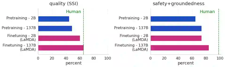 We present LaMDA: Language Models for Dialog Applications. LaMDA is a family of Transformer-based neural language models specialized for dialog, which have up to 137B parameters and are pre-trained on 1.56T words of public dialog data and web text. While model scaling alone can improve quality, it shows less improvements on safety and factual grounding. We demonstrate that fine-tuning with annotated data and enabling the model to consult external knowledge sources can lead to significant improvements towards the two key challenges of safety and factual grounding. The first challenge, safety, involves ensuring that the model's responses are consistent with a set of human values, such as preventing harmful suggestions and unfair bias. We quantify safety using a metric based on an illustrative set of human values, and we find that filtering candidate responses using a LaMDA classifier fine-tuned with a small amount of crowdworker-annotated data offers a promising approach to improving model safety. The second challenge, factual grounding, involves enabling the model to consult external knowledge sources, such as an information retrieval system, a language translator, and a calculator. We quantify factuality using a groundedness metric, and we find that our approach enables the model to generate responses grounded in known sources, rather than responses that merely sound plausible. Finally, we explore the use of LaMDA in the domains of education and content recommendations, and analyze their helpfulness and role consistency.