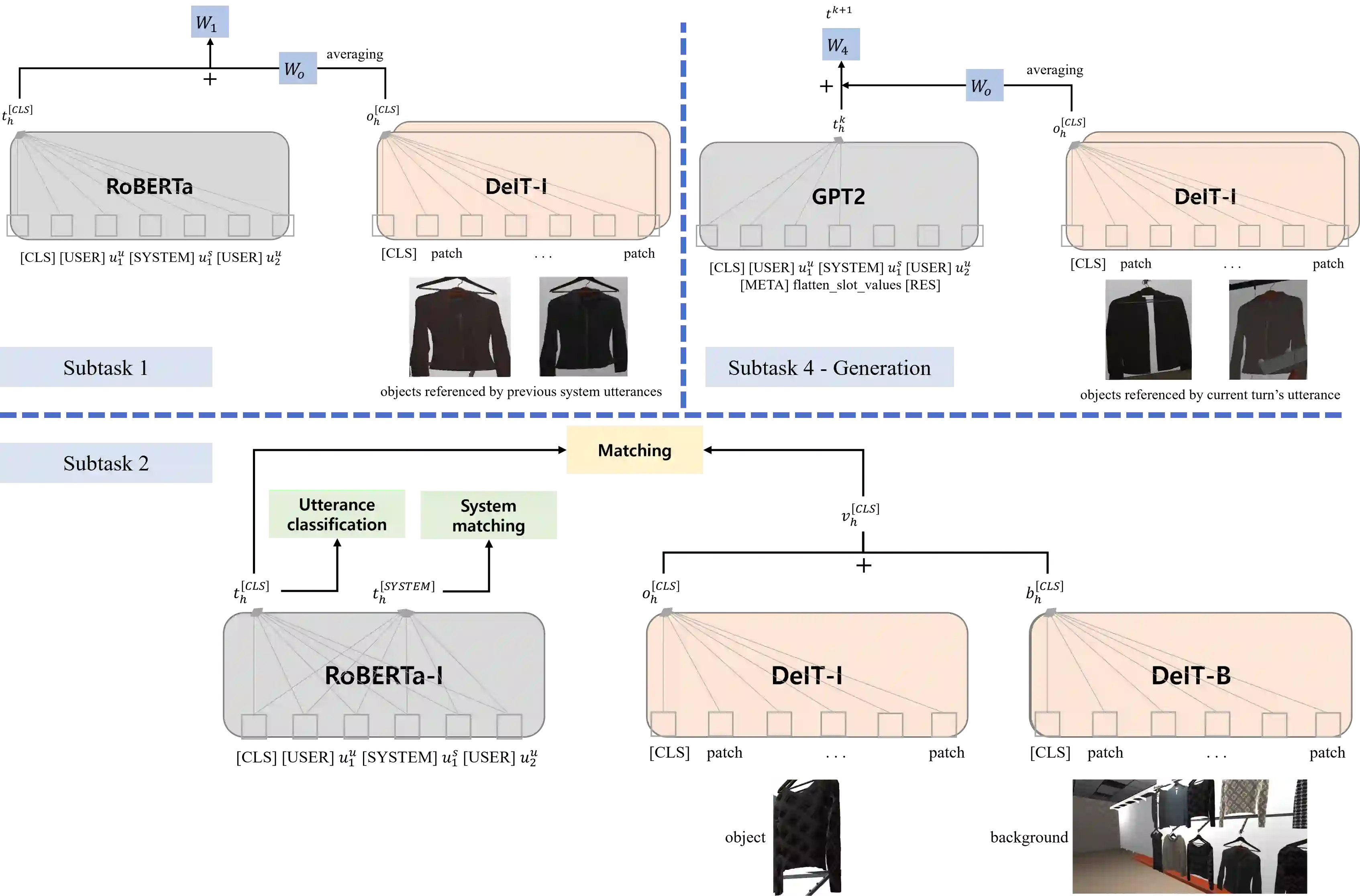 翻译:本文介绍我们在 " 对话国跟踪挑战10 " 中进行的关于 " 点点互动多式互动多式对话2.0挑战 " 的工作。 SIMMC 2. 0 包括4个子任务,我们为子任务+1, ⁇ 2和生成子任务+4. SIMMC 2. 0 数据集介绍了我们的多式方法。 SIMMC 2. 0 数据集是一个包含图像和文本信息的多式数据集,这比仅仅基于文本的对话问题更具挑战性,因为它必须通过理解图像和文本之间的关系来解决。因此,由于只解决像BERT或GPT2这样的文本模型是有限度的,我们建议采用一个将图像和文本相结合的多式模型。我们首先为多式模型预设了理解图像和文本之间关系的模式,然后对每一项任务进行微调。我们在子任务+1, ⁇ 2 和子任务+4. 的生成中取得了第三种最佳性能。源代码可在https://github.com/rungjoo/simmc2.0上查阅。