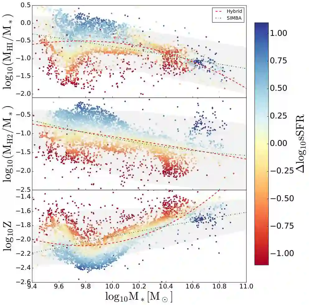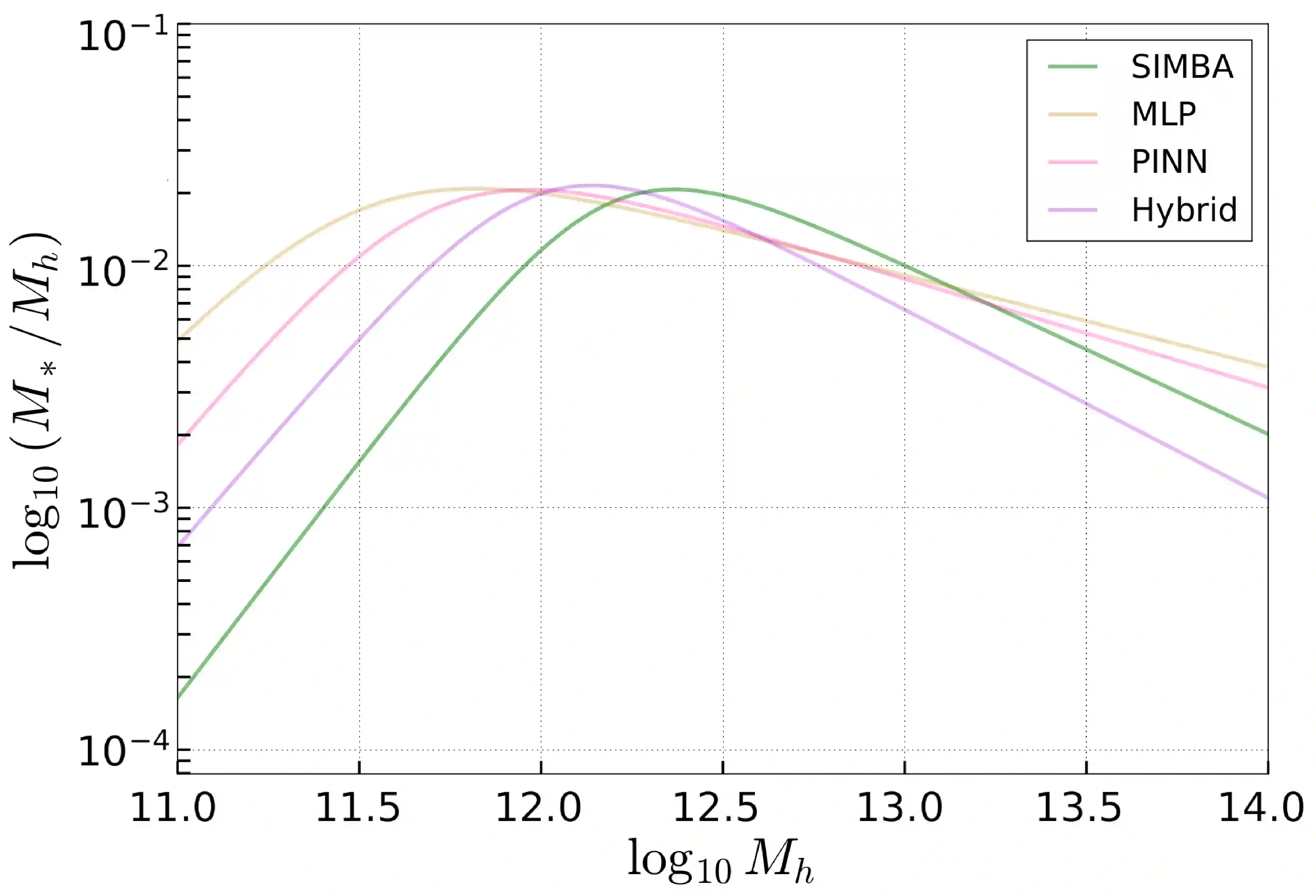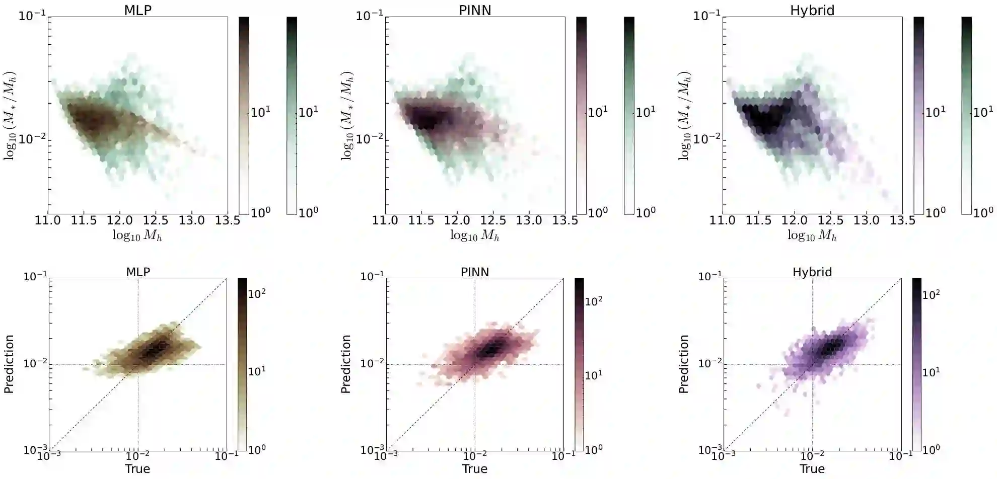Physics-informed neural networks have emerged as a coherent framework for building predictive models that combine statistical patterns with domain knowledge. The underlying notion is to enrich the optimization loss function with known relationships to constrain the space of possible solutions. Hydrodynamic simulations are a core constituent of modern cosmology, while the required computations are both expensive and time-consuming. At the same time, the comparatively fast simulation of dark matter requires fewer resources, which has led to the emergence of machine learning algorithms for baryon inpainting as an active area of research; here, recreating the scatter found in hydrodynamic simulations is an ongoing challenge. This paper presents the first application of physics-informed neural networks to baryon inpainting by combining advances in neural network architectures with physical constraints, injecting theory on baryon conversion efficiency into the model loss function. We also introduce a punitive prediction comparison based on the Kullback-Leibler divergence, which enforces scatter reproduction. By simultaneously extracting the complete set of baryonic properties for the Simba suite of cosmological simulations, our results demonstrate improved accuracy of baryonic predictions based on dark matter halo properties, successful recovery of the fundamental metallicity relation, and retrieve scatter that traces the target simulation's distribution.
