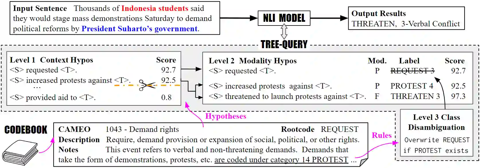 Recent supervised models for event coding vastly outperform pattern-matching methods. However, their reliance solely on new annotations disregards the vast knowledge within expert databases, hindering their applicability to fine-grained classification. To address these limitations, we explore zero-shot approaches for political event ontology relation classification, by leveraging knowledge from established annotation codebooks. Our study encompasses both ChatGPT and a novel natural language inference (NLI) based approach named ZSP. ZSP adopts a tree-query framework that deconstructs the task into context, modality, and class disambiguation levels. This framework improves interpretability, efficiency, and adaptability to schema changes. By conducting extensive experiments on our newly curated datasets, we pinpoint the instability issues within ChatGPT and highlight the superior performance of ZSP. ZSP achieves an impressive 40% improvement in F1 score for fine-grained Rootcode classification. ZSP demonstrates competitive performance compared to supervised BERT models, positioning it as a valuable tool for event record validation and ontology development. Our work underscores the potential of leveraging transfer learning and existing expertise to enhance the efficiency and scalability of research in the field.