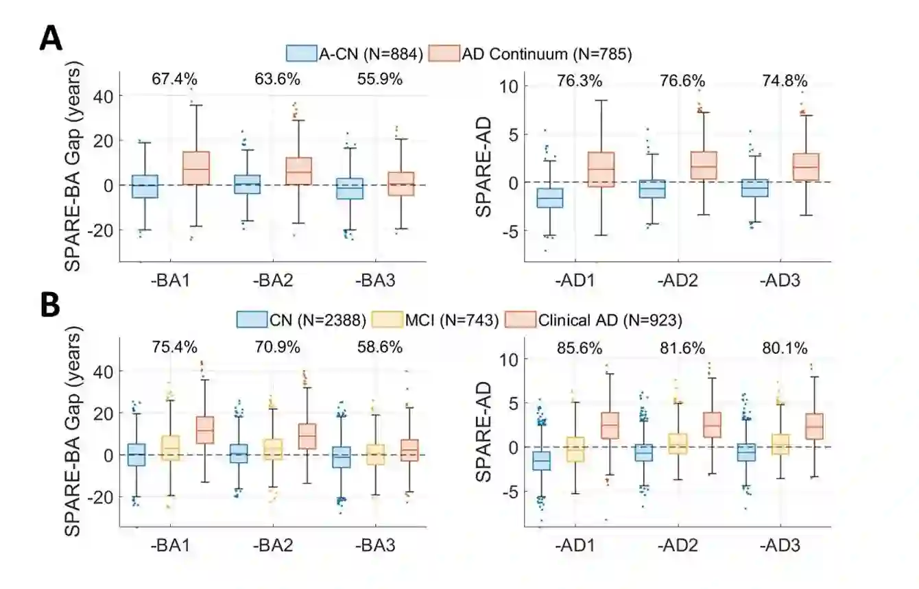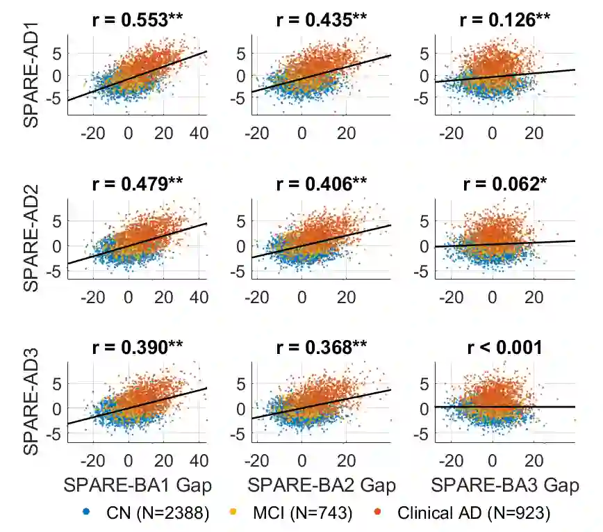 翻译:将典型的大脑老化和阿尔茨海默氏病(AD)区分开来的生物标志中,将典型的大脑老化和阿尔茨海默氏病(AD)区分开来,对于确定每种疾病对认知下降的贡献有多大是有价值的。机器学习模型可以得出与这两个过程有关的多变大脑变化模式,包括SAPARE-AD(承认阿尔茨海默氏病的萎缩模式)和SPARE-BA(大脑进化)所有调查。然而,在两个过程中受影响的大脑区域之间有很大的重叠,我们展示了一种方法来分解这两种疾病。T1加权的MRI图像,4 054参与者(48-95岁)的T1加权MRI图像(48-95岁),有AD、轻度认知障碍(MCI)的大脑变化模式,或认知正常的 iSTAGA(以STem 和NAAAAAA(亚纳亚士亚士亚氏)的货币和SAAA(AAAAAAA)的亚运和AAAAAAAAAAA(进化)类和AAAAAAAAAAAAAAA(亚纳基)的肝和AAAA和AAAAAAAA(基)的肝和AAAAAAAA(基)的肝和AAA(基)的肝和AAAAAAAAAAA(基)的分级的分数的分数组,选择的分数组的肝和A和AAAAAAAAA)的分数(基)的分数组的分数)的分数组,选择的分。的分。和A,选择组和AA)的分的分数组的分。。