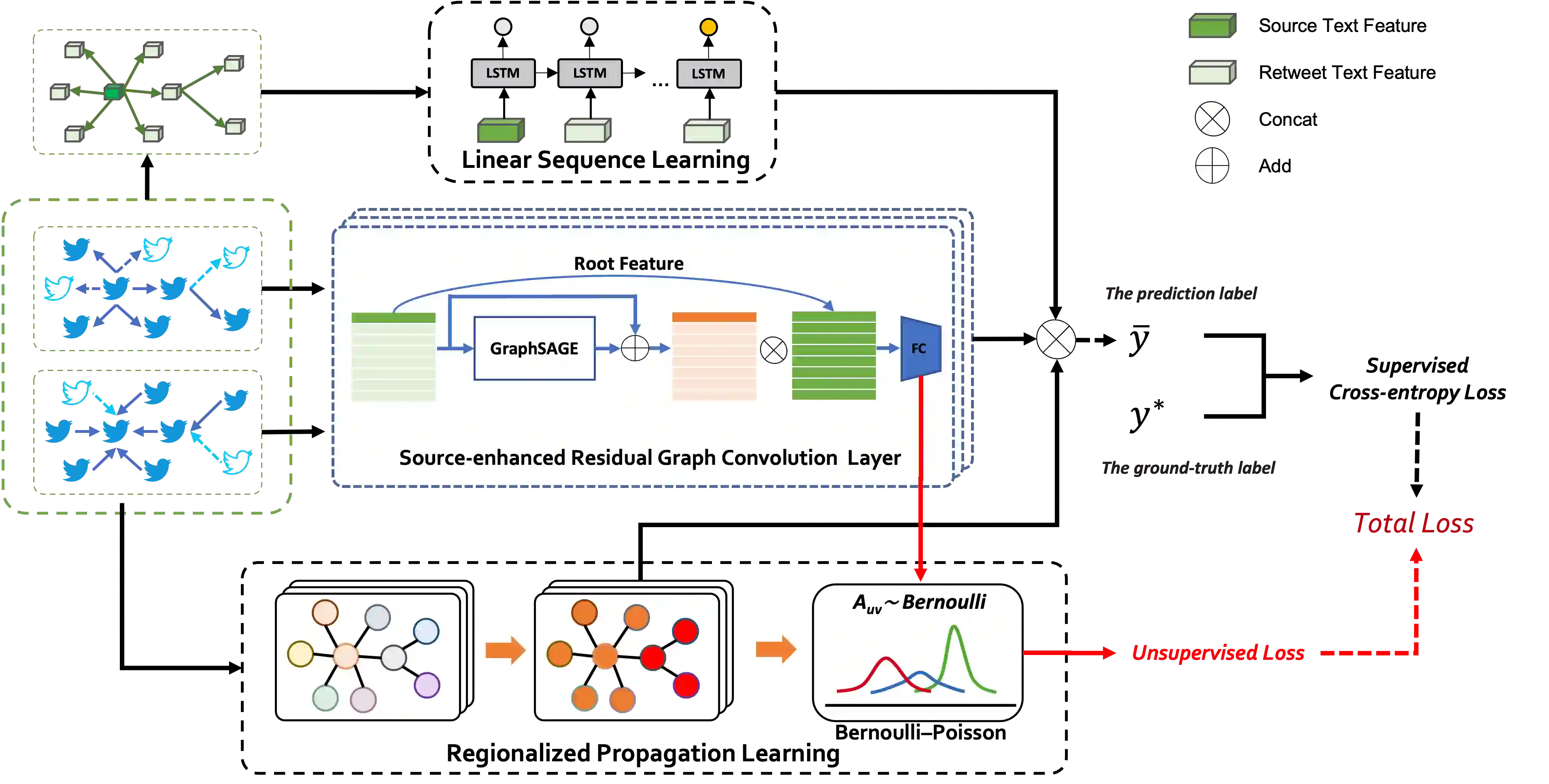 翻译:社会媒体在公共领域迅速发展,因为其容易传播新信息,从而导致流言的传播。然而,从如此大量的信息中发现流言正日益成为一项艰巨的挑战。以往的工作通常从传播信息中获得宝贵的特征。应当指出,大多数方法仅针对传播结构,而忽视传言传播模式。这种有限的重点严重限制了传播数据的收集。为解决这一问题,本研究报告的作者们积极探索流言的区域化传播模式。具体而言,一个创新的、区域强化的深图集网络(RDGCN),通过学习区域化传播模式和通过不受监督的学习培训学习传播模式来强化流言的传播特征。此外,还提出了一种来源强化的残余图象共变层(SRGCL),目的是改进图象网络超高的光度,并增加基于流言探测方法的深度限制。Twitter15和Twitter16实验显示,拟议的模型比对流言探测和早期谣言探测的基线方法要好。