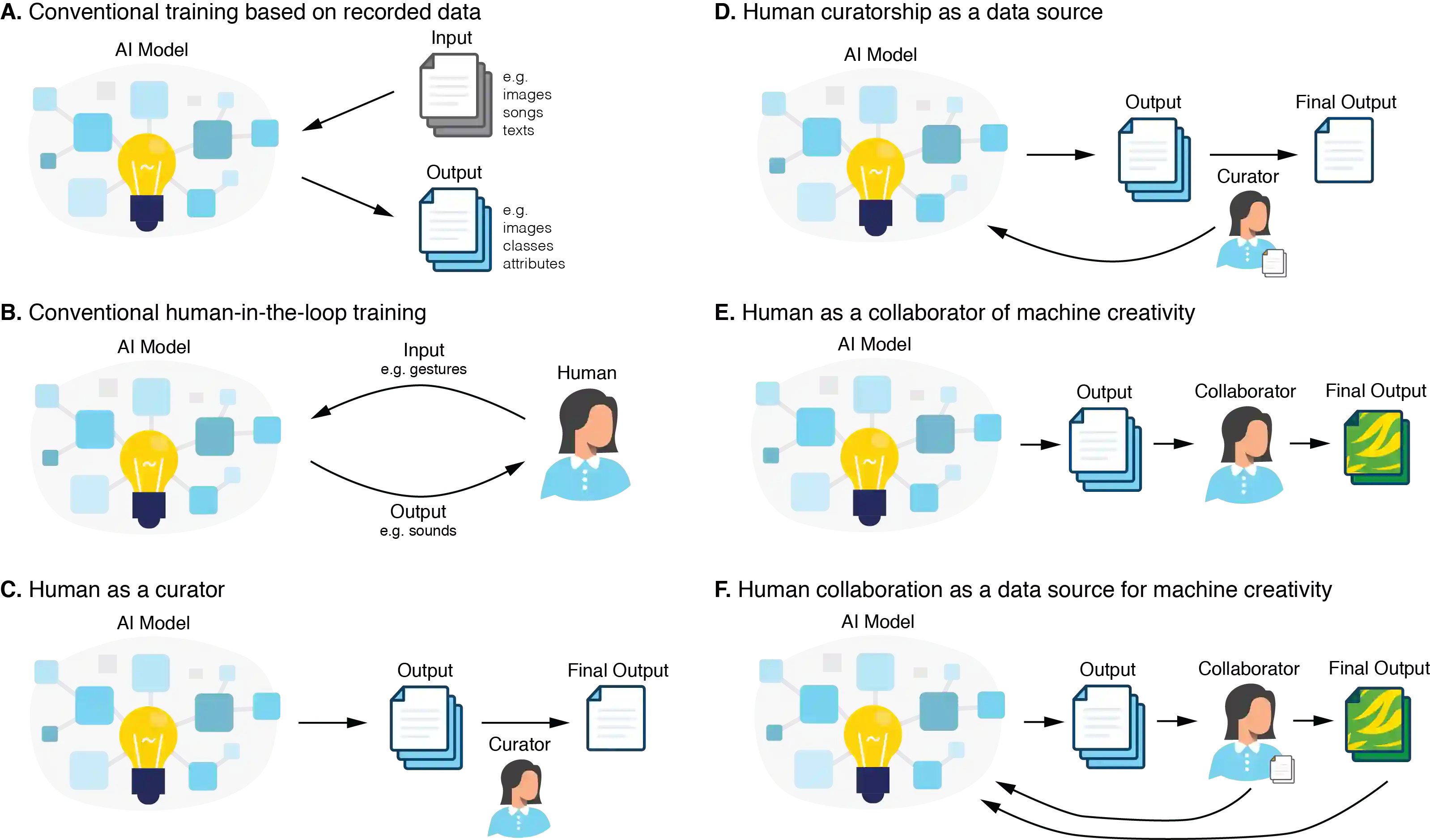 翻译:人工智能(AI)越来越多地用于合成视觉、文本和音频。这些基于人工智能的作品通常来自神经网络,正在进入主流市场,作为数字绘画、歌曲、书籍和其他。我们构思了现有和未来的“流动中人”(HITL)的创造性应用方法,并开发了更直观、细微和多式的模型。特别是,我们作为管理员和协作者的专门知识如何以互动的方式在AI模型中编码?我们研究和猜测对模型、界面和机器创造力的长期影响。我们对人工智能艺术的选择、创造和解释必然包含我们的情感反应、文化和背景。因此,拟议的“HITL”可以帮助算法学习难以编纂或量化的创造性过程。我们设想了“多式”的“流动人”过程,其中的文字、视觉、声音和其他信息与人类和环境的自动分析相结合。总体而言,这些“智能”方法将增加人与AI之间的相互作用,从而帮助未来的AI系统更好地了解我们自己的创造性和情感过程。