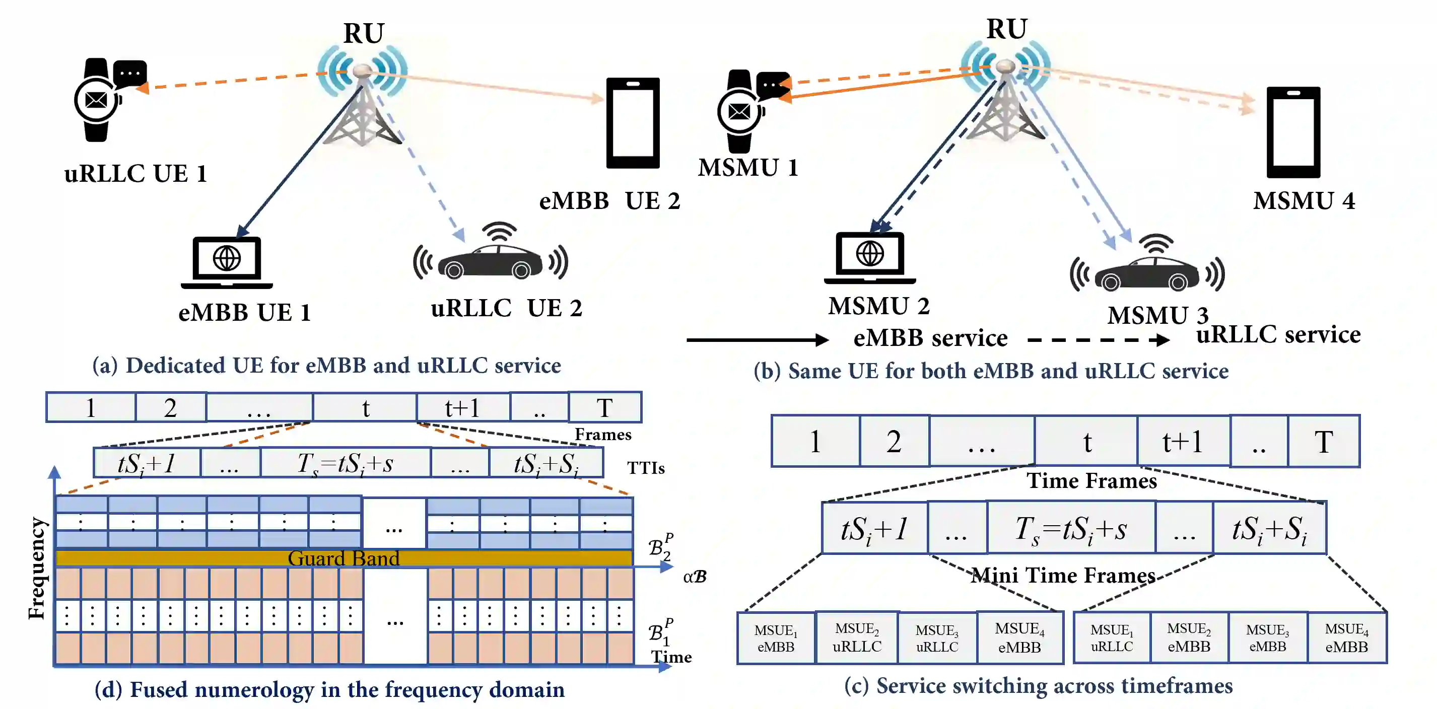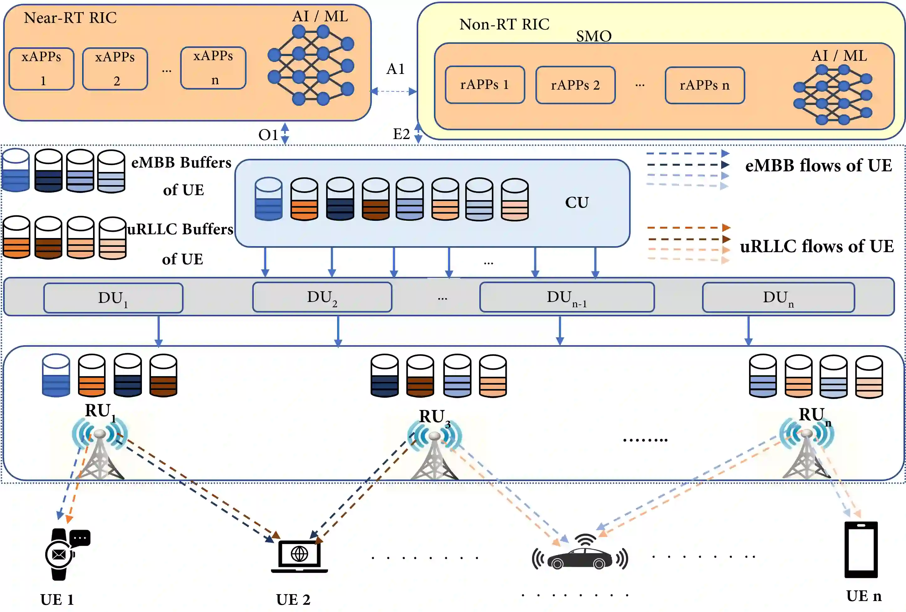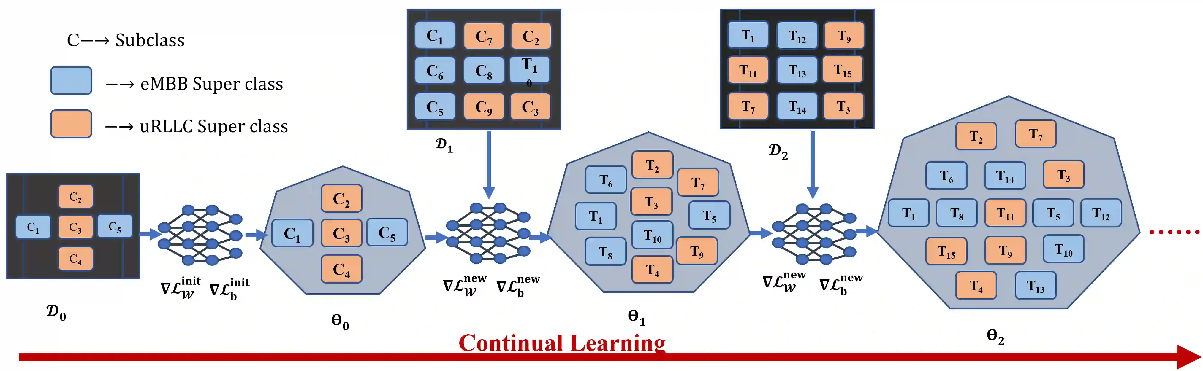 翻译:本文提出了一种人工智能驱动的高效无线接入网管理框架。该框架引入了多业务模态用户设备系统的概念,使单一用户设备能够同时处理增强型移动宽带和超可靠低时延通信业务。所提框架在不确定性条件下整合了流量需求预测、路由优化、无线接入网切片、业务识别与无线资源管理。通过将优化问题分解为长期子问题和短期子问题,解决了此类系统中动态环境带来的挑战。利用长短期记忆模型,所提方法能够预测增强型移动宽带与超可靠低时延通信的流量需求,并在长期子问题中为无线接入网切片确定最优路由。针对短期子问题,采用另一长短期记忆模型基于长期预测结果处理实时业务类型识别与资源管理。为支持持续自适应,短期子问题框架中引入了持续学习机制,使模型能够在学习新业务类型的同时保留先验知识。实验结果表明,所提框架能有效管理双模用户设备,在流量需求、资源块预测和功率预测方面分别获得0.003、0.003和0.002的低均方误差,业务类型与路由选择准确率达99%,在七项任务中持续业务自适应的平均准确率超过95%。