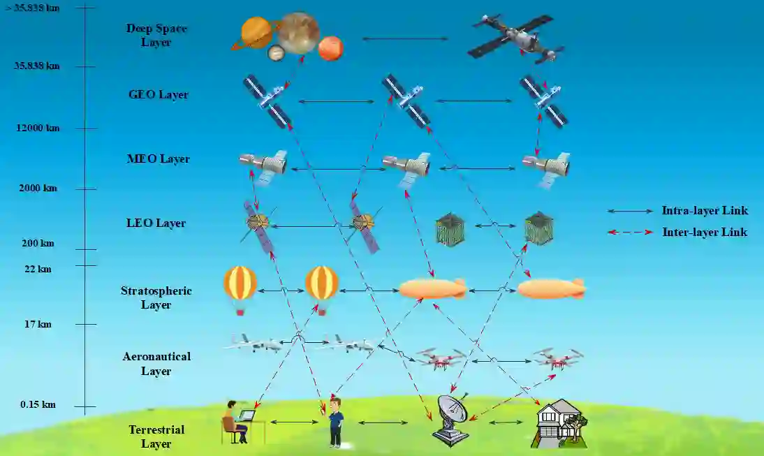 翻译:本文概述了无线网络第六代(6G)的关键推动者之一,即综合卫星-航空网络的点对点连接(P2P),预计这些联系是无线网络第六代(6G)的关键推动者之一,首先概述了这类综合大型复杂网络的独特性,通常以空间网络为标志,并侧重于两个特定的空间-空气基础设施,即卫星网络和高纬度平台(HAPs),然后将连接的P2P通信连接归类为同一层的卫星-卫星连接(SSLL)、不同层次的卫星-卫星连接(SSLD)和HAP-HAP链接(HHL),论文分别概述了这类空间网络的每个层次,并着重介绍了连接(即无线电-频率或自由空间光学)的可能性质,并专门概述了现有的链接预算结果。随后,论文介绍了实现这种综合卫星-卫星-卫星通信网络在服务不足和偏远地区提供宽带服务的潜在好处。最后,论文展示了未来智能空间网络、大规模空间访问网络的智能化、多层空间访问网的智能化、离载式网络的智能化、高载式空间网络、离层网络。
