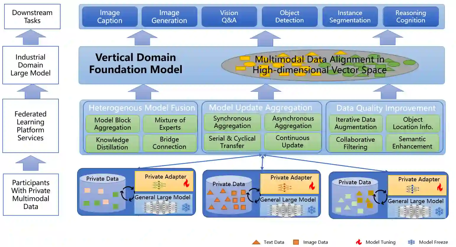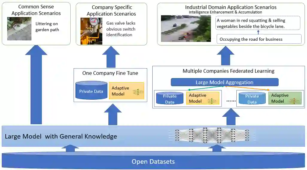 Multimodal data, which can comprehensively perceive and recognize the physical world, has become an essential path towards general artificial intelligence. However, multimodal large models trained on public datasets often underperform in specific industrial domains. This paper proposes a multimodal federated learning framework that enables multiple enterprises to utilize private domain data to collaboratively train large models for vertical domains, achieving intelligent services across scenarios. The authors discuss in-depth the strategic transformation of federated learning in terms of intelligence foundation and objectives in the era of big model, as well as the new challenges faced in heterogeneous data, model aggregation, performance and cost trade-off, data privacy, and incentive mechanism. The paper elaborates a case study of leading enterprises contributing multimodal data and expert knowledge to city safety operation management , including distributed deployment and efficient coordination of the federated learning platform, technical innovations on data quality improvement based on large model capabilities and efficient joint fine-tuning approaches. Preliminary experiments show that enterprises can enhance and accumulate intelligent capabilities through multimodal model federated learning, thereby jointly creating an smart city model that provides high-quality intelligent services covering energy infrastructure safety, residential community security, and urban operation management. The established federated learning cooperation ecosystem is expected to further aggregate industry, academia, and research resources, realize large models in multiple vertical domains, and promote the large-scale industrial application of artificial intelligence and cutting-edge research on multimodal federated learning.