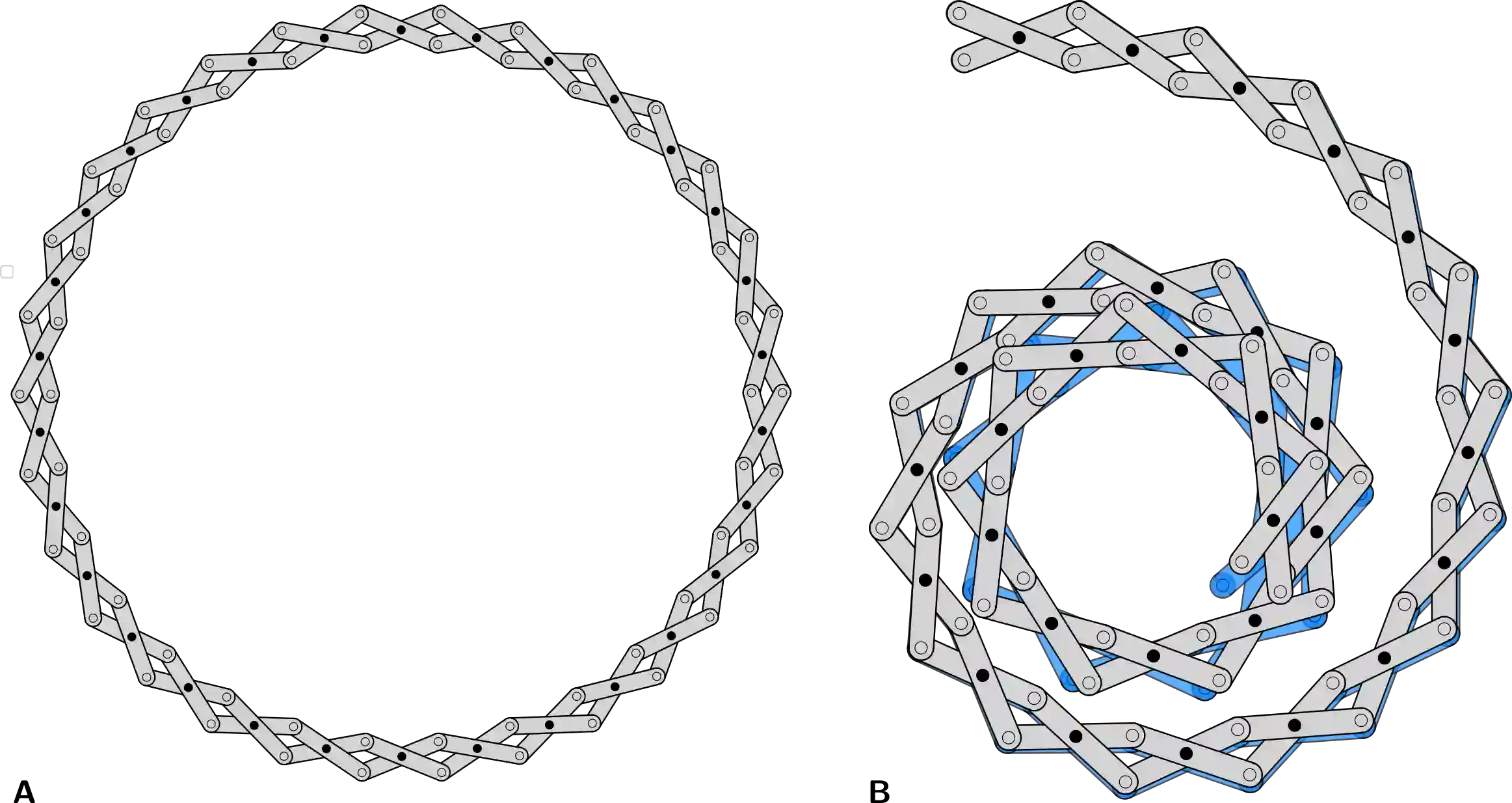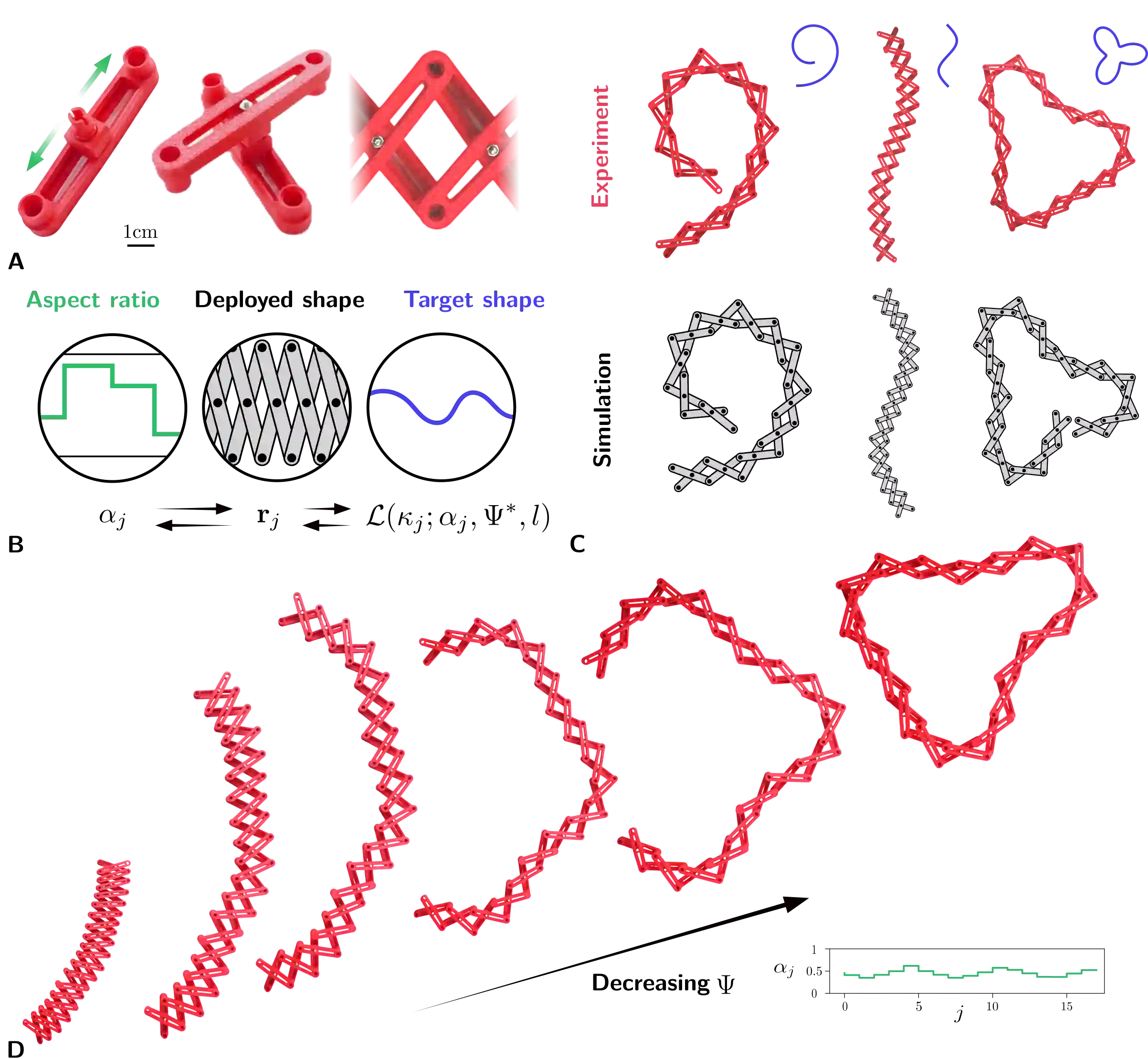 翻译:机构运动学与其几何结构紧密耦合,其应用价值通常源于能够以较少的驱动自由度实现可重复运动。本文探讨了由剪刀单元构成的装配体,每个单元由两根刚性直杆通过销轴连接而成。该装配体具有单一自由度,驱动任意单个单元即可引发整体结构的形状变化。我们推导了单元有效曲率及机构末端轨迹的表达式,这些表达式是几何变量的函数,并以此为基础在机构中编程实现两项任务:形态变换与书写。通过将任务表述为优化问题并利用可微分仿真框架,我们获得了相应解决方案,随后在桌面实验中进行了验证。结果表明,结合优化框架,剪刀装配体的几何特性可用于复杂领域的自动导航与检测。然而,我们强调,在无反馈实验中实现快速编程与无差错执行仍面临挑战。