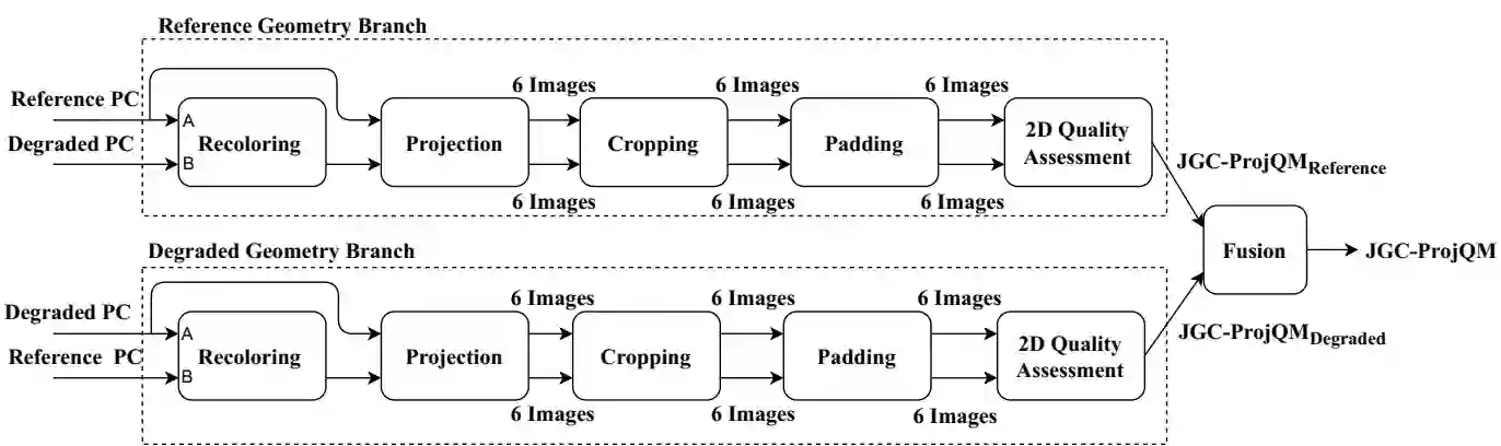Point cloud coding solutions have been recently standardized to address the needs of multiple application scenarios. The design and assessment of point cloud coding methods require reliable objective quality metrics to evaluate the level of degradation introduced by compression or any other type of processing. Several point cloud objective quality metrics has been recently proposed to reliable estimate human perceived quality, including the so-called projection-based metrics. In this context, this paper proposes a joint geometry and color projection-based point cloud objective quality metric which solves the critical weakness of this type of quality metrics, i.e., the misalignment between the reference and degraded projected images. Moreover, the proposed point cloud quality metric exploits the best performing 2D quality metrics in the literature to assess the quality of the projected images. The experimental results show that the proposed projection-based quality metric offers the best subjective-objective correlation performance in comparison with other metrics in the literature. The Pearson correlation gains regarding D1-PSNR and D2-PSNR metrics are 17% and 14.2 when data with all coding degradations is considered.