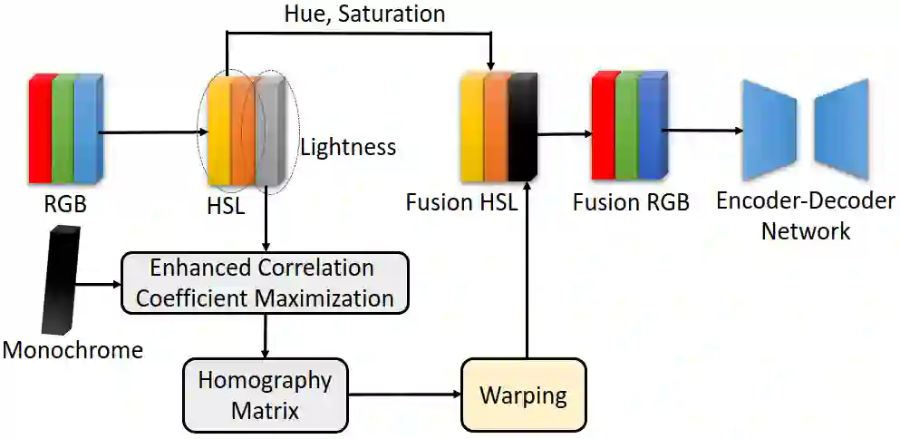 Depth estimation plays a important role in SLAM, odometry, and autonomous driving. Especially, monocular depth estimation is profitable technology because of its low cost, memory, and computation. However, it is not a sufficiently predicting depth map due to a camera often failing to get a clean image because of light conditions. To solve this problem, various sensor fusion method has been proposed. Even though it is a powerful method, sensor fusion requires expensive sensors, additional memory, and high computational performance. In this paper, we present color image and monochrome image pixel-level fusion and stereo matching with partially enhanced correlation coefficient maximization. Our methods not only outperform the state-of-the-art works across all metrics but also efficient in terms of cost, memory, and computation. We also validate the effectiveness of our design with an ablation study.