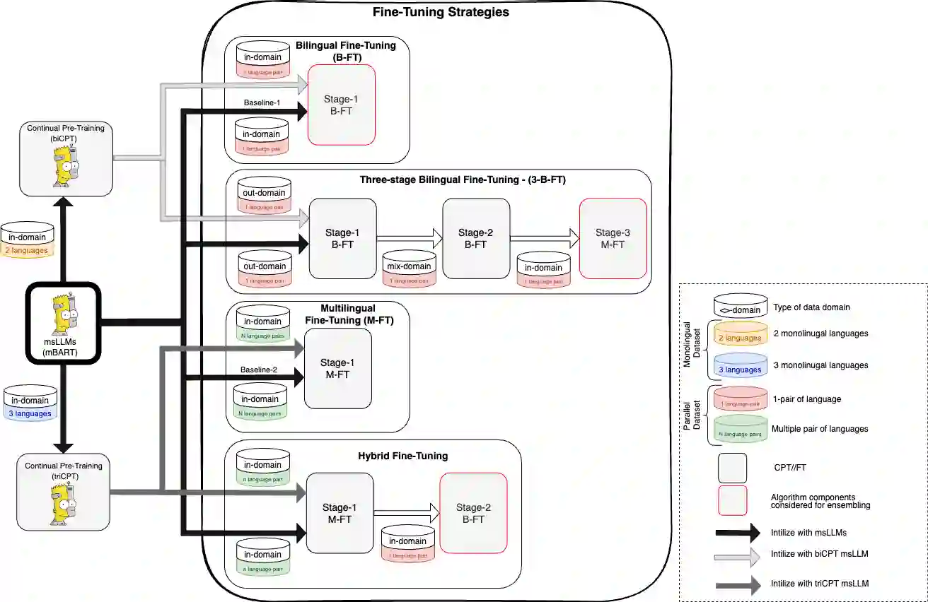 Fine-tuning multilingual sequence-to-sequence large language models (msLLMs) has shown promise in developing neural machine translation (NMT) systems for low-resource languages (LRLs). However, conventional single-stage fine-tuning methods struggle in extremely low-resource NMT settings, where training data is very limited. This paper contributes to artificial intelligence by proposing two approaches for adapting msLLMs in these challenging scenarios: (1) continual pre-training (CPT), where the msLLM is further trained with domain-specific monolingual data to compensate for the under-representation of LRLs, and (2) intermediate task transfer learning (ITTL), a method that fine-tunes the msLLM with both in-domain and out-of-domain parallel data to enhance its translation capabilities across various domains and tasks. As an application in engineering, these methods are implemented in NMT systems for Sinhala, Tamil, and English (six language pairs) in domain-specific, extremely low-resource settings (datasets containing fewer than 100,000 samples). Our experiments reveal that these approaches enhance translation performance by an average of +1.47 bilingual evaluation understudy (BLEU) score compared to the standard single-stage fine-tuning baseline across all translation directions. Additionally, a multi-model ensemble further improves performance by an additional BLEU score.
