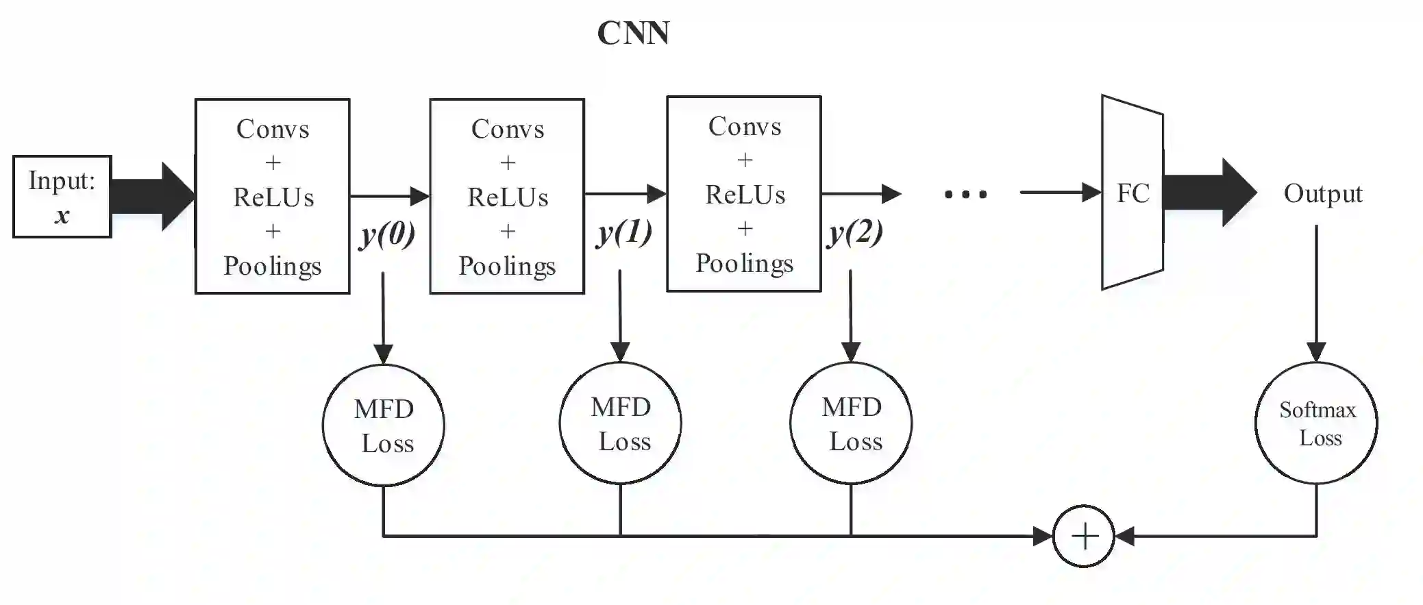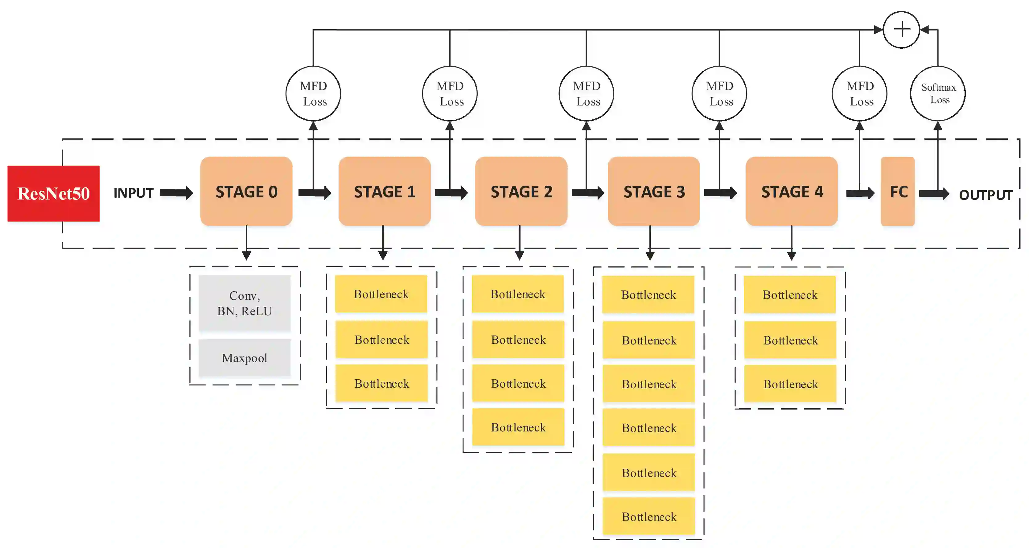 For the convolutional neural network (CNN) used for pattern classification, the training loss function is usually applied to the final output of the network, except for some regularization constraints on the network parameters. However, with the increasing of the number of network layers, the influence of the loss function on the network front layers gradually decreases, and the network parameters tend to fall into local optimization. At the same time, it is found that the trained network has significant information redundancy at all stages of features, which reduces the effectiveness of feature mapping at all stages and is not conducive to the change of the subsequent parameters of the network in the direction of optimality. Therefore, it is possible to obtain a more optimized solution of the network and further improve the classification accuracy of the network by designing a loss function for restraining the front stage features and eliminating the information redundancy of the front stage features .For CNN, this article proposes a multi-stage feature decorrelation loss (MFD Loss), which refines effective features and eliminates information redundancy by constraining the correlation of features at all stages. Considering that there are many layers in CNN, through experimental comparison and analysis, MFD Loss acts on multiple front layers of CNN, constrains the output features of each layer and each channel, and performs supervision training jointly with classification loss function during network training. Compared with the single Softmax Loss supervised learning, the experiments on several commonly used datasets on several typical CNNs prove that the classification performance of Softmax Loss+MFD Loss is significantly better. Meanwhile, the comparison experiments before and after the combination of MFD Loss and some other typical loss functions verify its good universality.