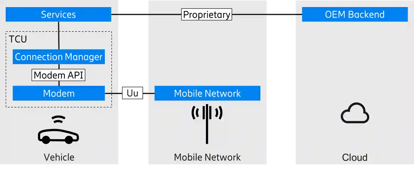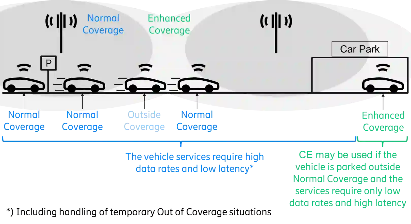 The Third Generation Partnership Project (3GPP) has standardized Coverage Enhancement (CE) for Internet-of-Things (IoT) to connect devices in challenging radio conditions with cellular networks. CE is based on the principle of prolonged transmission time that exploits the fact that many IoT applications have relaxed requirements on data rate and latency, and the coverage can be significantly boosted by repeating transmissions for such applications. However, CE consumes a lot of radio resources and should be implemented carefully for different applications. This paper presents an end-to-end concept for realizing dynamic use of CE for connected vehicles in a resource efficient way. The proposed framework has the potential of improving coverage by around 10dB for low data rate connected vehicle applications, based on the 3GPP Long Term Evolution (LTE) standard.